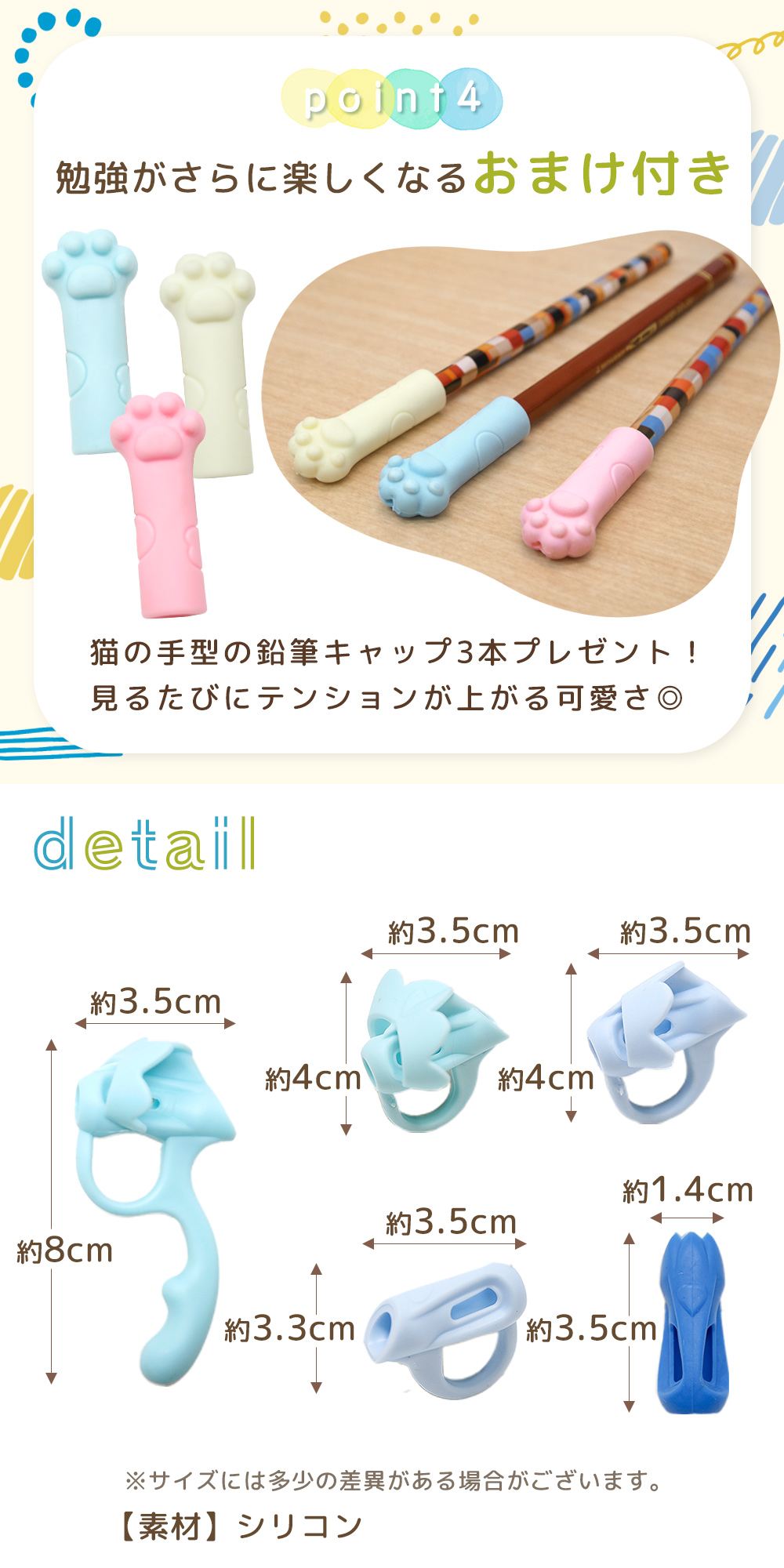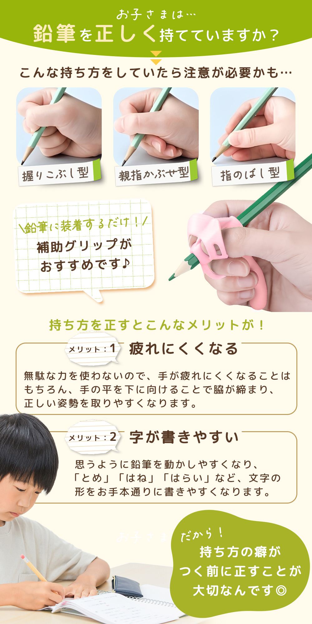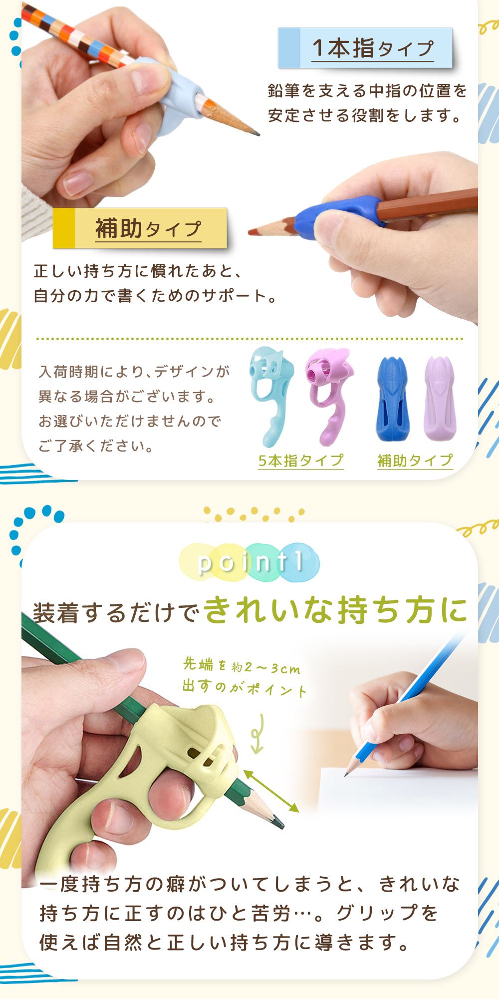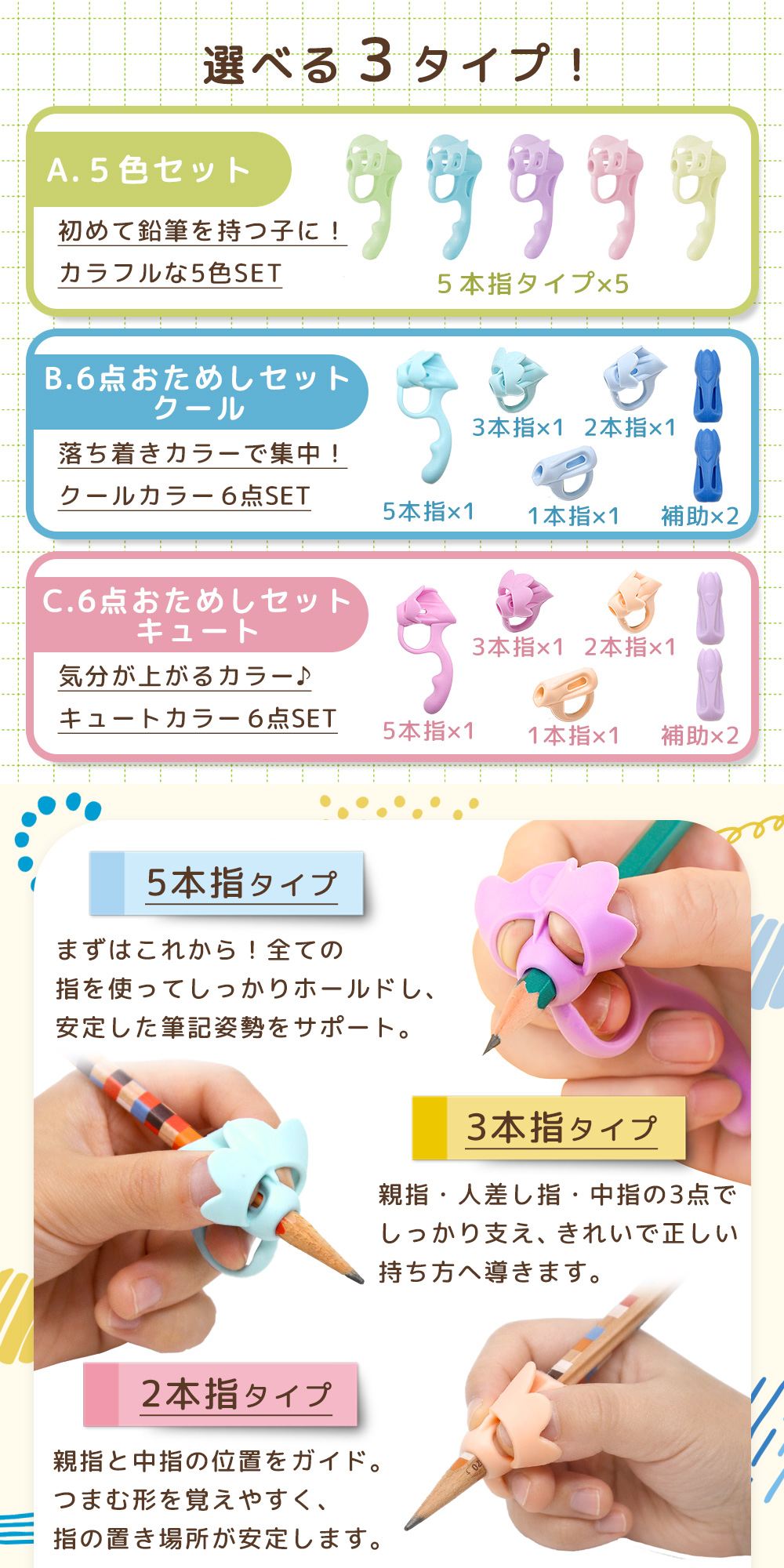 鉛筆の持ち方が安定しにくい子どもでも、指の位置が分かりやすい補助具です。えんぴつの持ち方を毎日の勉強の中で少しずつ習得できるようサポートします。