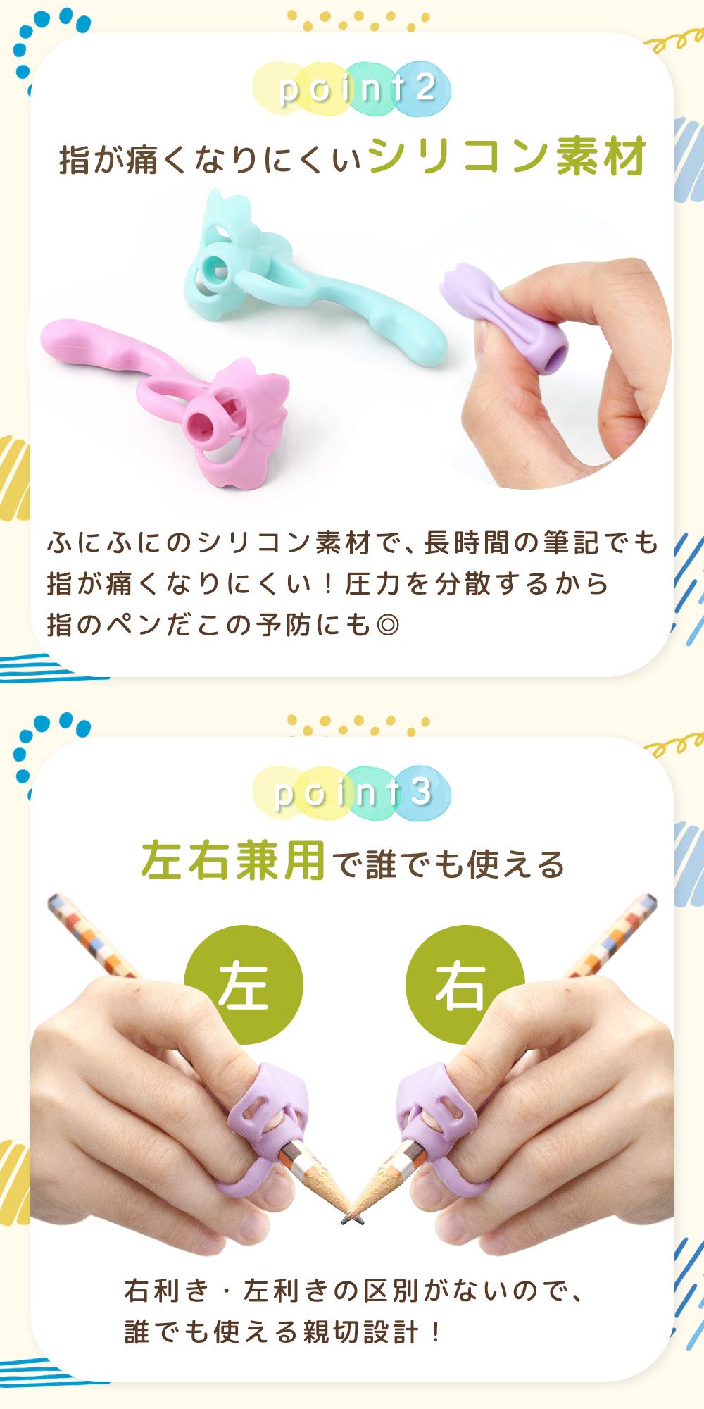 右利き・左利きどちらでも使える左右兼用。幼児から小学生まで、キッズの手に合わせて握る位置がブレにくく、持ち方の矯正トレーニングを続けやすくします。