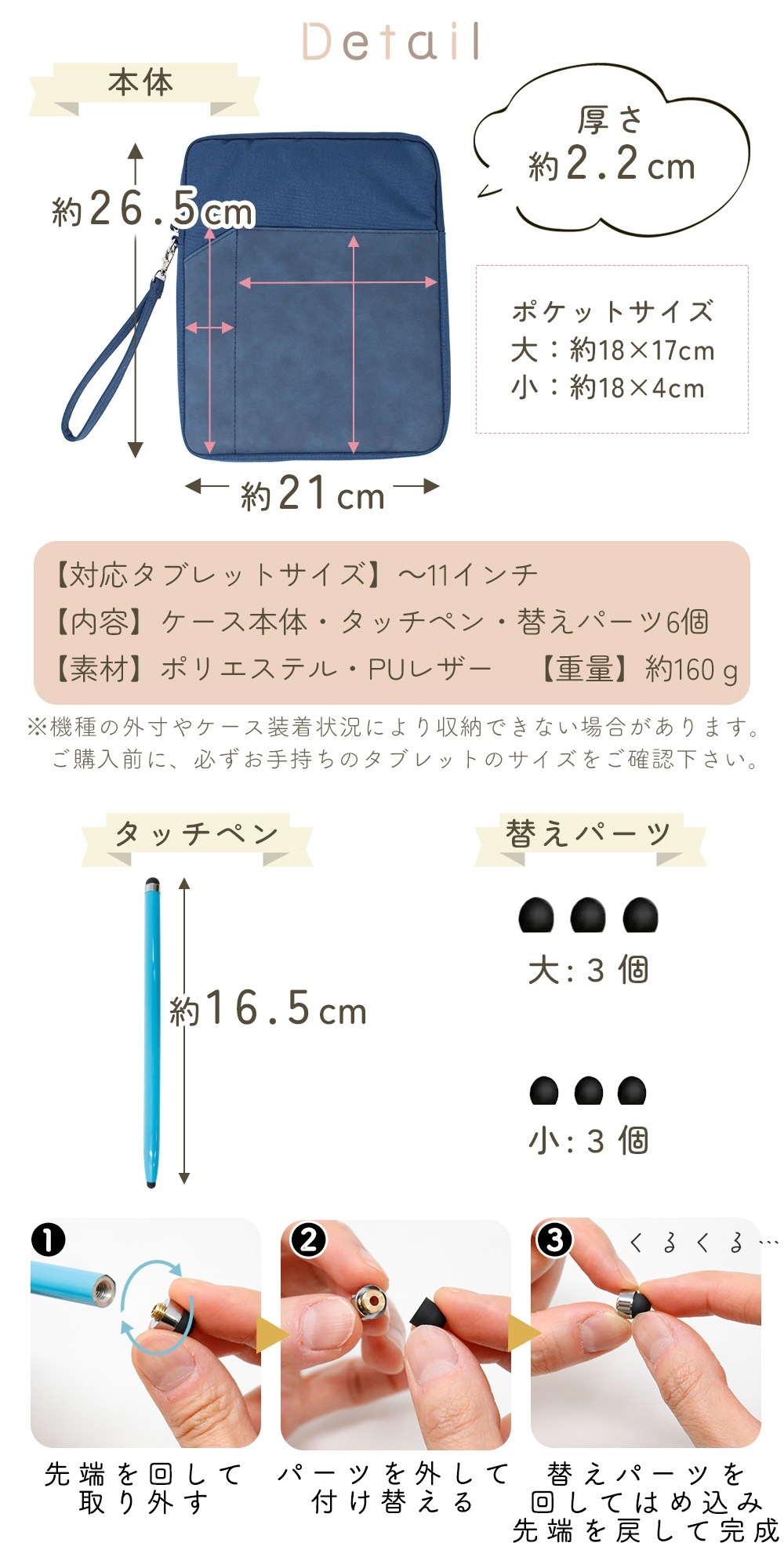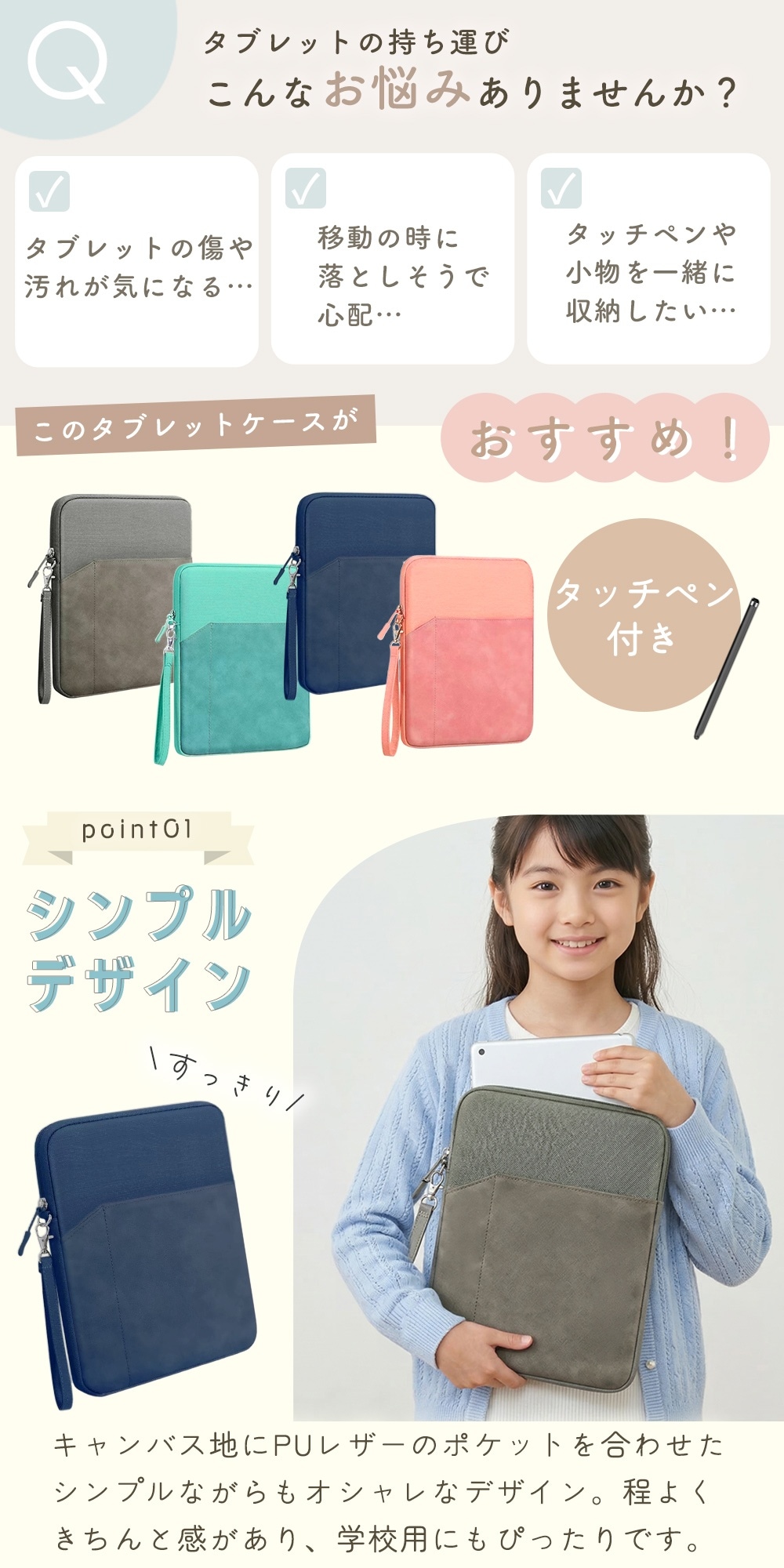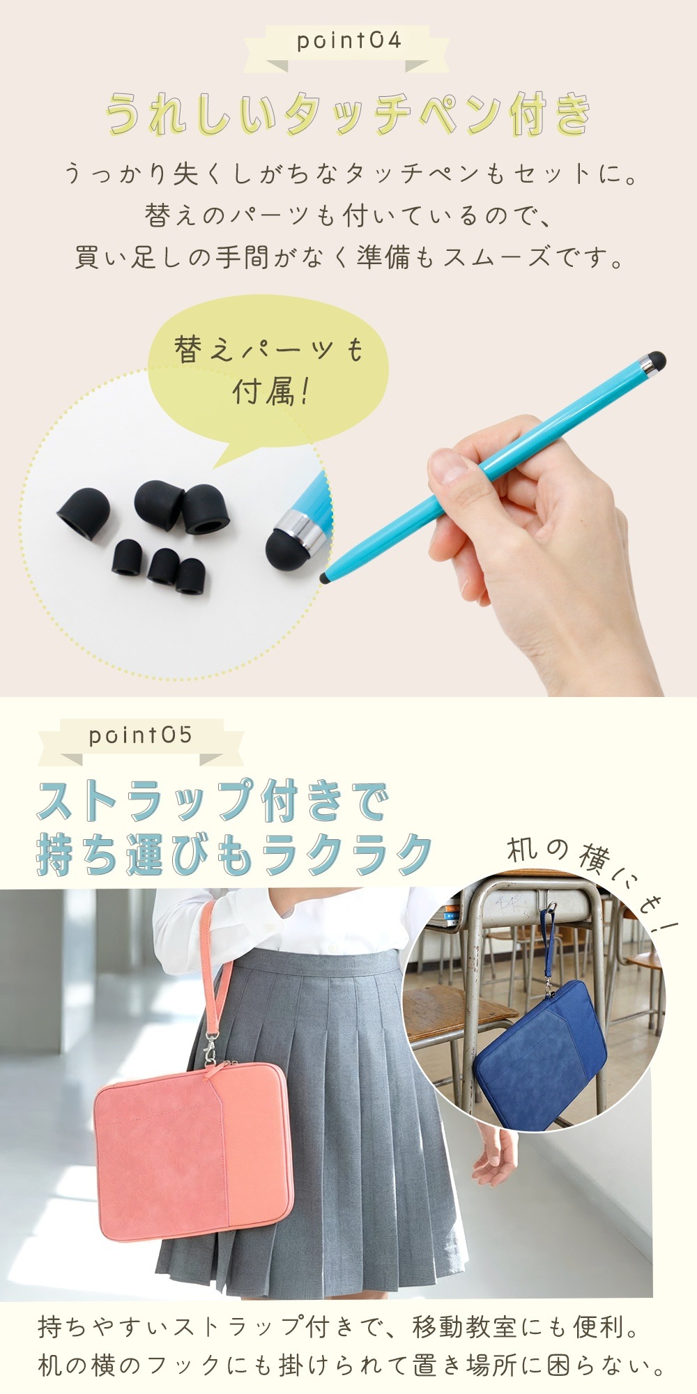 シンプル タブレットケース 学習用 タッチペン付き 11インチ ランドセルに入る ポケット付き 撥水 スリム 小学生 中学生 高校生 通学 授業用