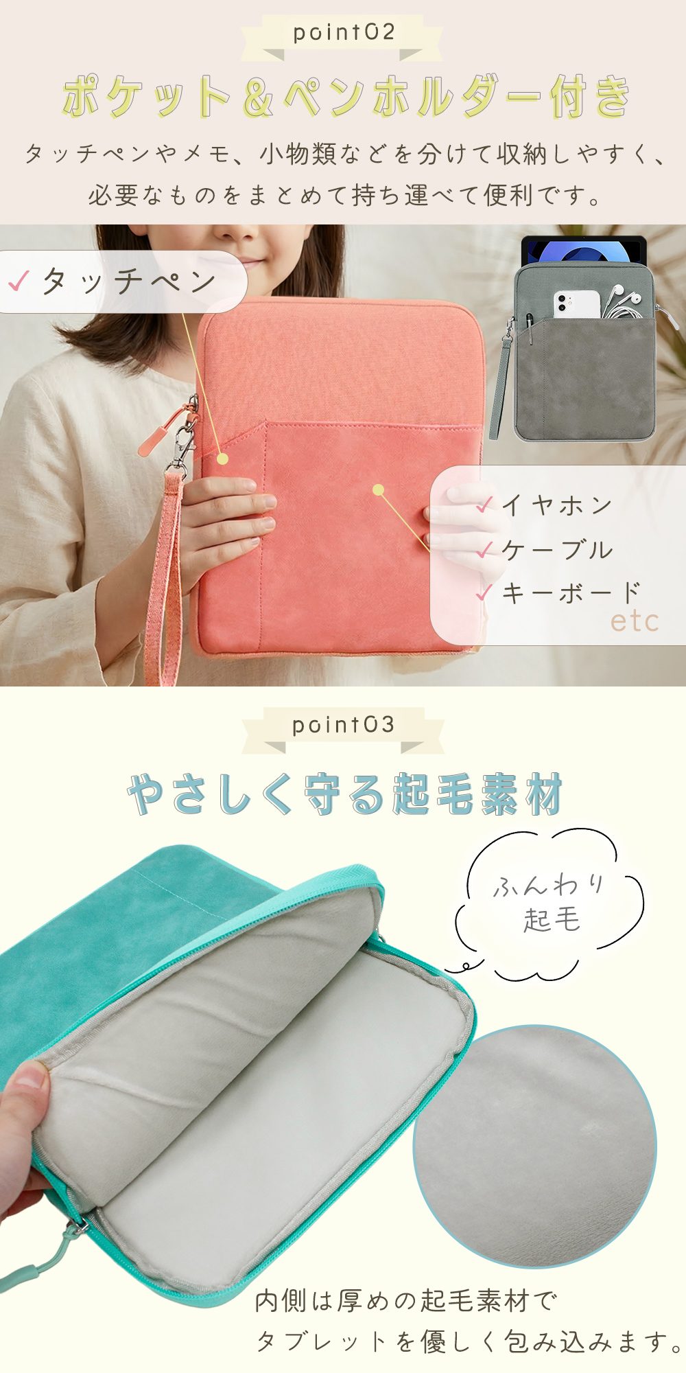 内側は起毛仕様で、タブレットをふんわり包み込みながらやさしく保護します。クッション性のあるつくりで、持ち運び時に気になる傷や汚れを防ぎたい時にも便利。大切な端末を破損から守り、きれいな状態で長く使いたい時にも役立ちます。