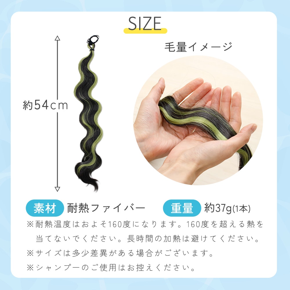 毛先はお好みに合わせてカットで長さ調節ができるため、ヘアスタイルに合わせて使いやすいバランスに整えられます。同色2本セットなので、左右アレンジやボリュームを出したいスタイルにも使いやすいのがうれしいポイントです。軽量で扱いやすく、耐熱素材で160℃まで対応しているため、アレンジの幅が広がります。姉妹でおそろい感を楽しみたいときにはもちろん、レディースにも取り入れやすいエクステです。