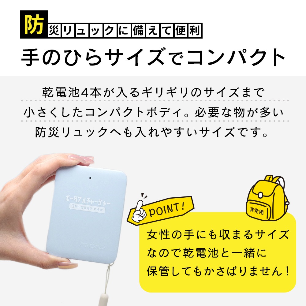 単三電池4本で動作し、電源が取れない状況でもスマートフォンの充電が可能。