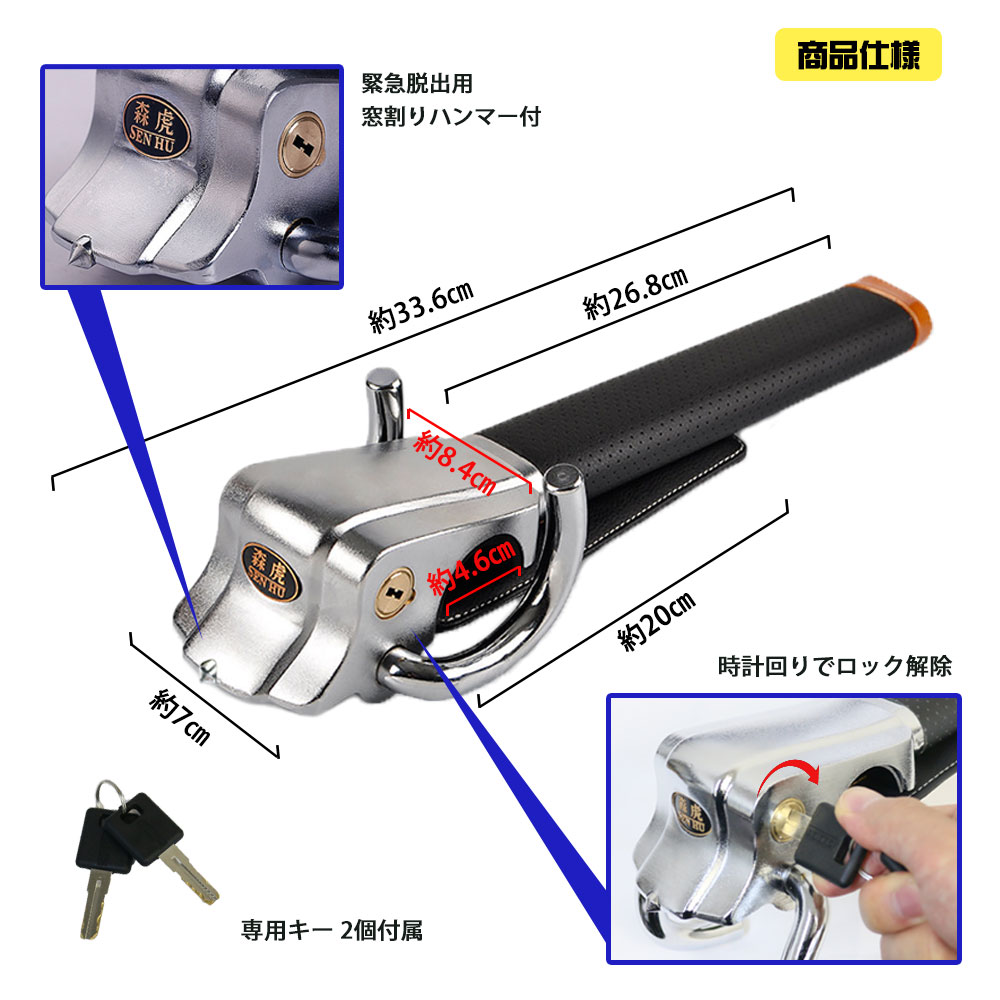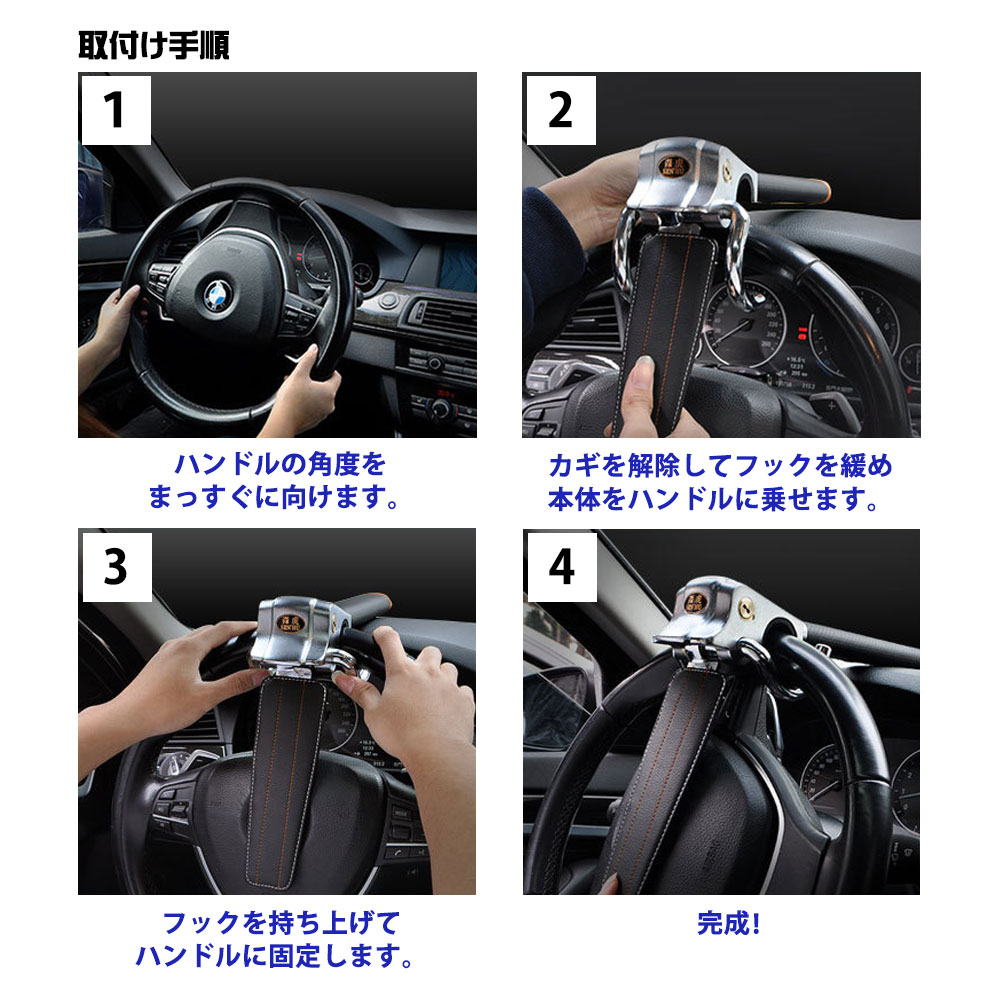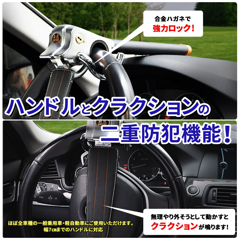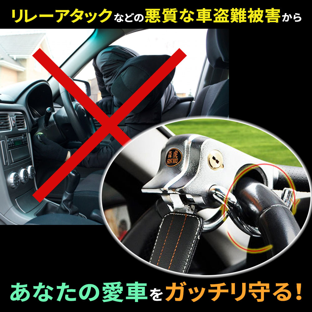 盗難防止/盗難/防止/愛車/車/守る/セーフティー/ロック/ハンドル/ハンドルロック/緊急/緊急脱出/窓/窓割ハンマー/フロントガラス/ガラス/調整可能/調整/盗難車/リレーアタック/リレーアタック防止/車盗難/固定/ハンドル固定/クラクション/二重/二重防犯/防犯/防犯機能/対策/ステアリングロック