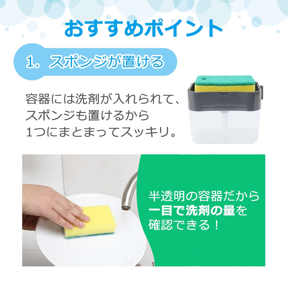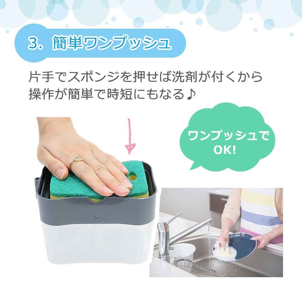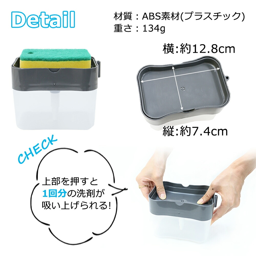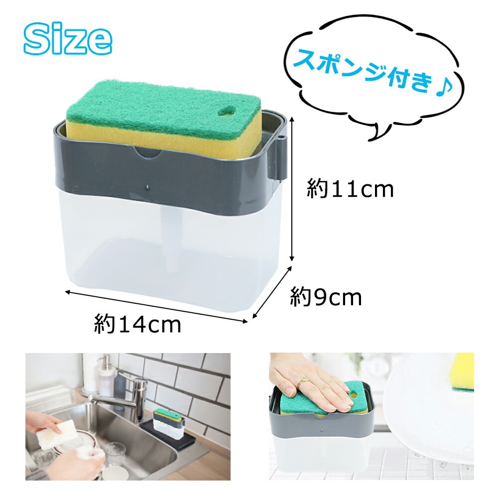 洗剤/食器/食器洗い/洗い/ディスペンサー/スポンジ/キッチン/キッチンスポンジ/キッチンスポンジホルダー/台所/台所洗剤/詰め替え用洗剤/スポンジホルダー/食器用洗剤/プッシュ/ワンプッシュ/半透明/コンパクト/軽量/シンク/水回り/洗面台/スポンジ付き/押し込む/プラスチック/プラスチック容器/