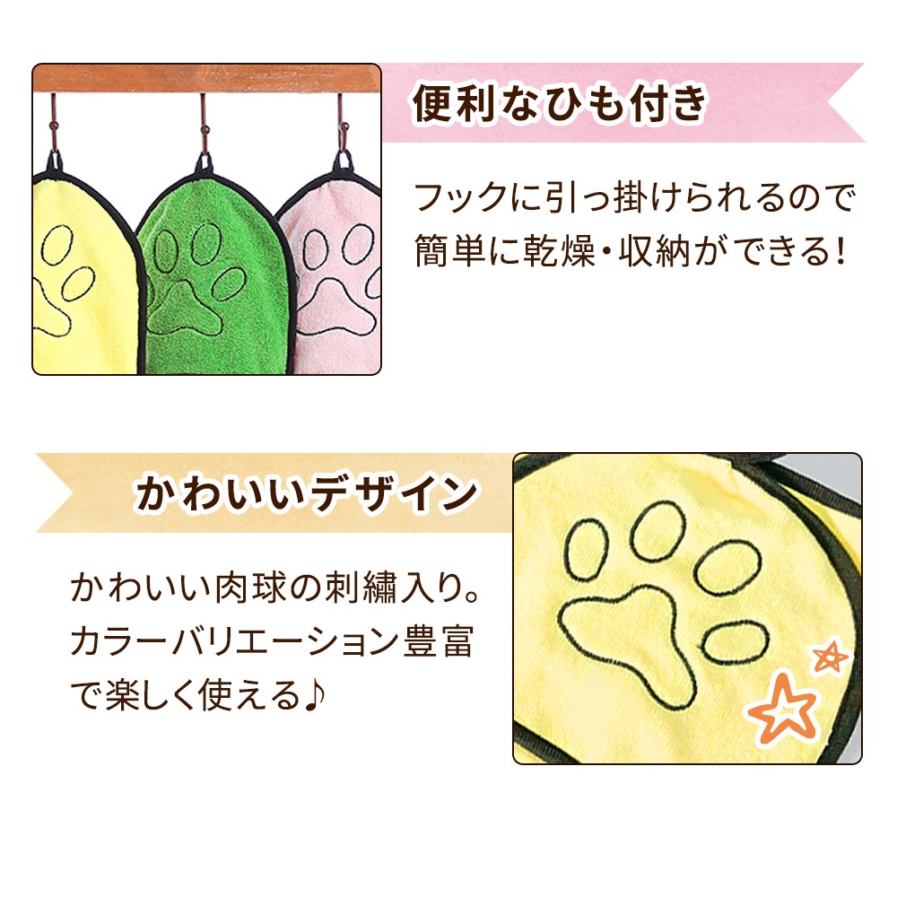 ペットタオル 2枚セット ペット タオル 犬 猫 吸水性 吸水 通気性 速乾 乾きやすい 柔らかい ポケット シャンプー ドライヤー 時短 コンパクト ひも ひも付き フック 肉球 かわいい 刺繍 ステッチ グレー グリーン スカイブルー ブルー パープル ピンク イエロー TN-PTWL