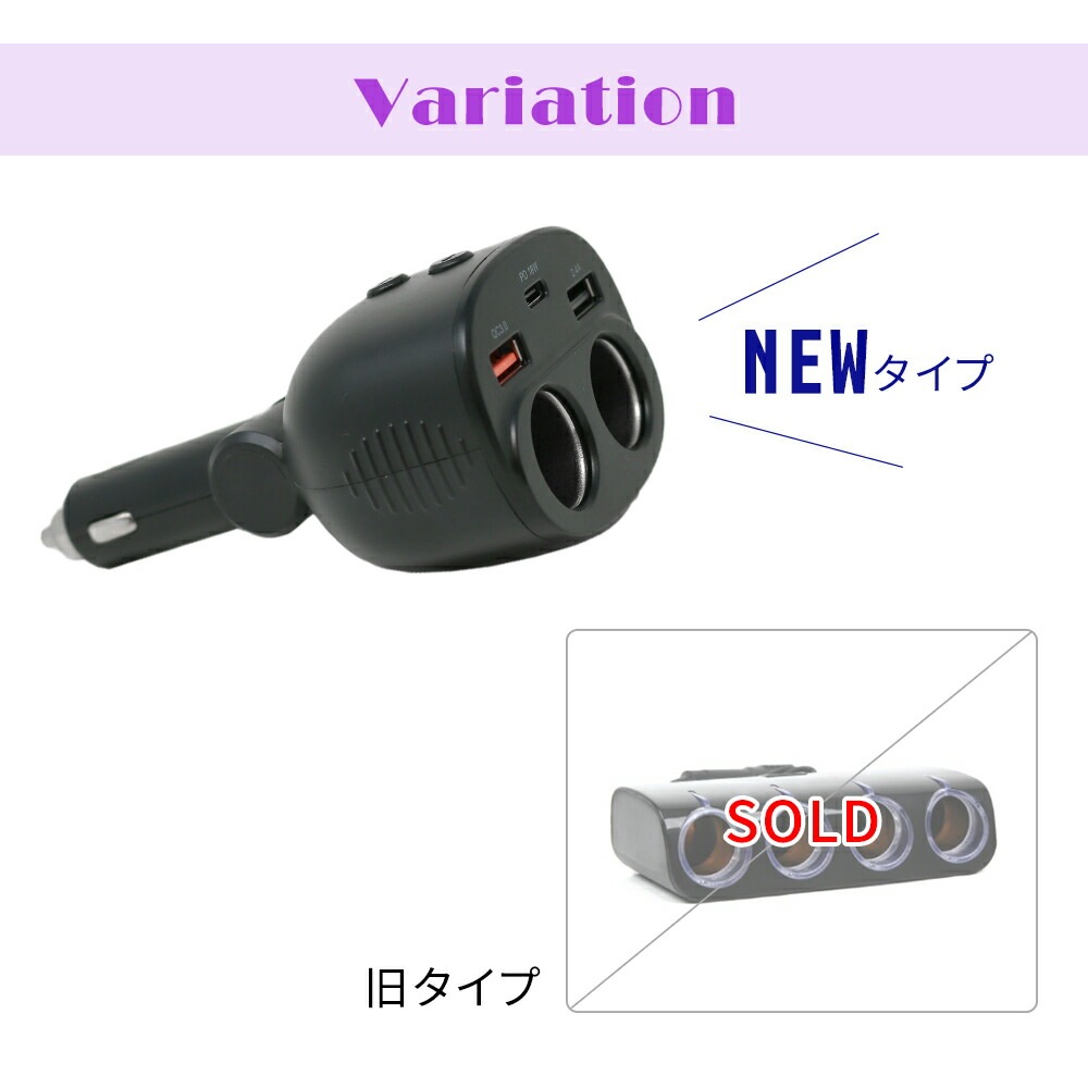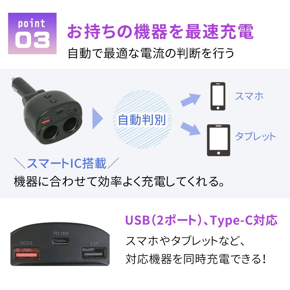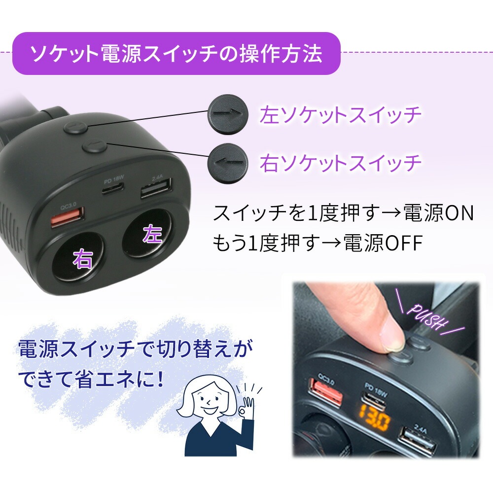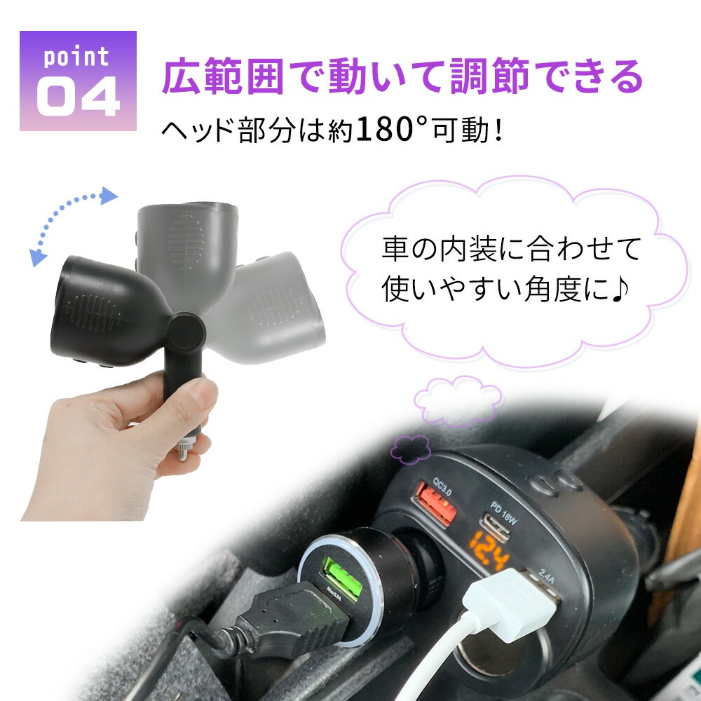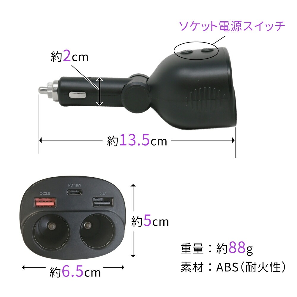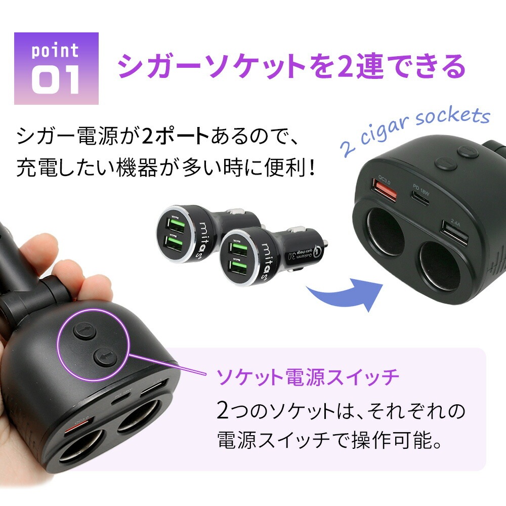 シガー/チャージャー/充電/充電器/車載充電/車/USB/2連/ソケット/2ソケット/増設/ソケット増設/スイッチ/切り替え/12V/5V/2.4A/QC3.0/Type-C/iPhone/Android/iPad/クイックチャージャー/タイプC/アイフォン/アンドロイド/スマホ/携帯/スマートIC/自動判別/角度調節/LEDライト
