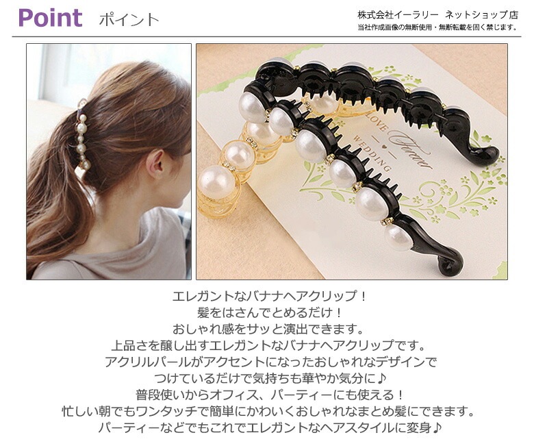 レディース/バナナクリップ/2個セット/パール調/ヘアクリップ/ヘアアクセサリー/おしゃれ/かわいい/髪飾り/髪留め/ラインストーン/ヘアーアクセ/オフィス/アップスタイル /ヘアアレンジ