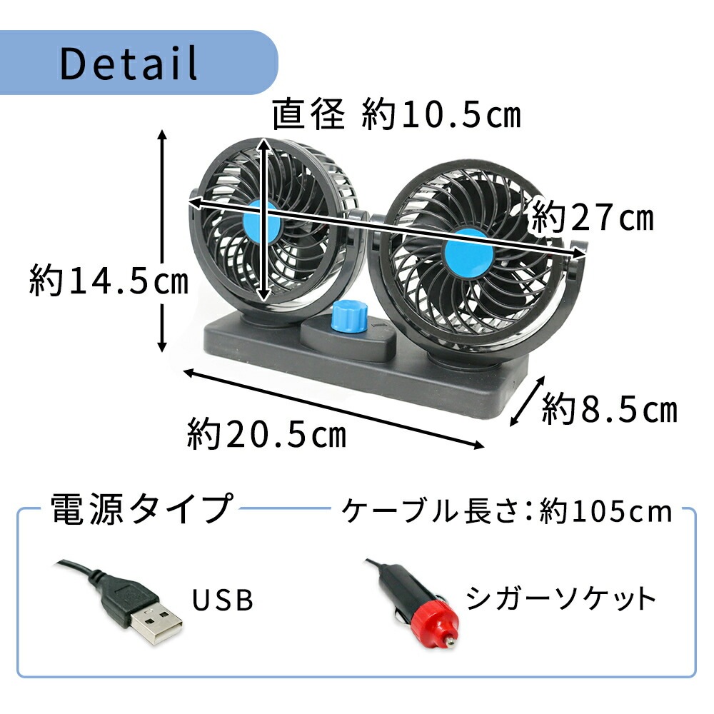 車載扇風機/車載用/ツインファン/USB/シガーソケット/12v/車/サーキュレーター/ファン/角度/風量/調節/自動車/エアコン/クーラー/涼しい/エコ/ガソリン/節約/省エネ/ダブル/扇風機/オフィス/デスク/自宅/夏/暑さ対策/空気循環/静音/粘着シート/取り付け簡単/カー用品/車用品/シガー電源/USB給電/ひんやり/冷却