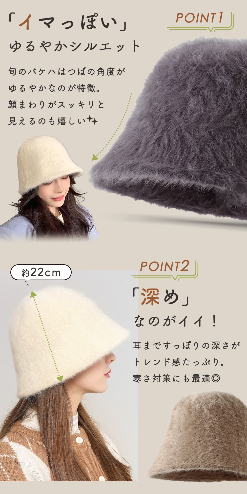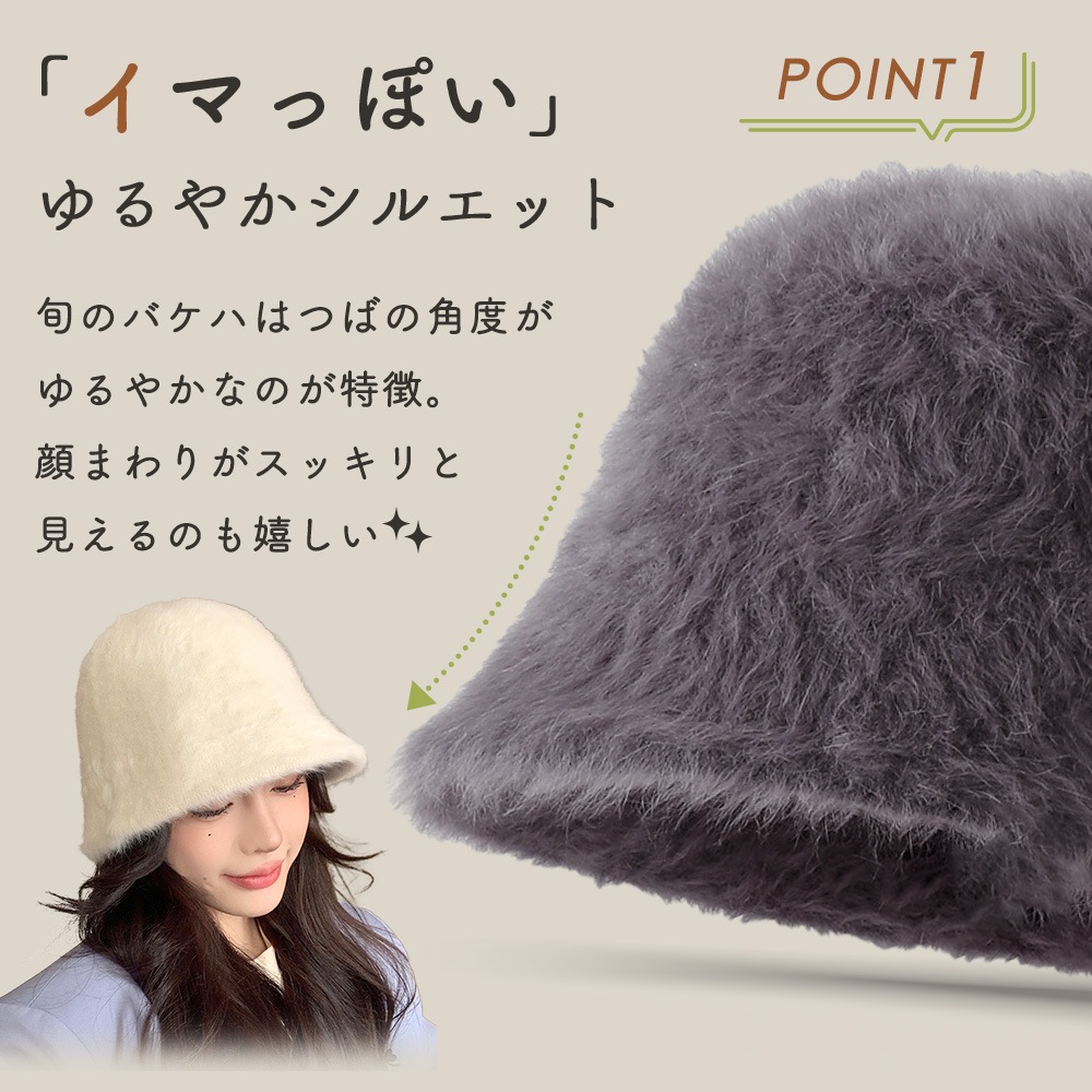 ふわふわとしたシャギー素材が目を引くバケットハット。