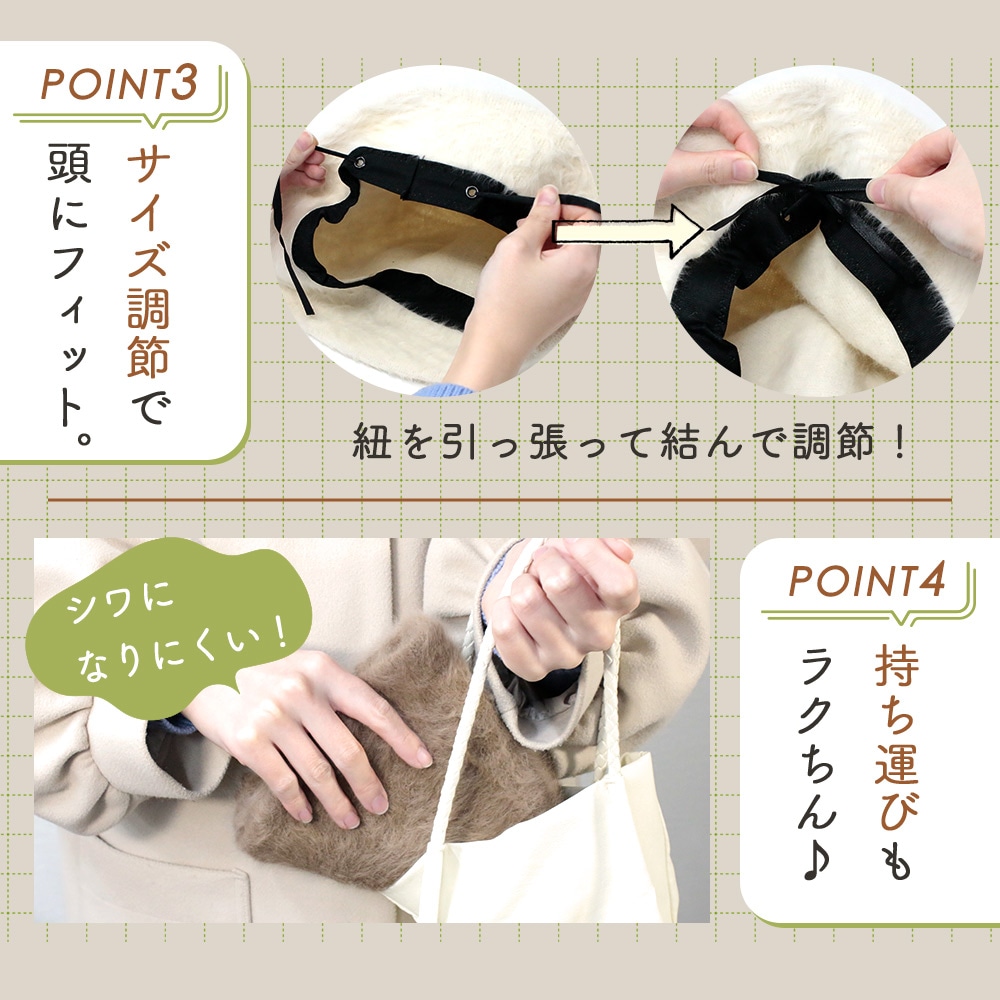 フェイクファー、エコファー素材を使用し、見た目以上に軽い被り心地。