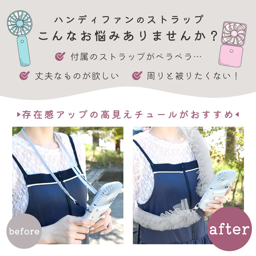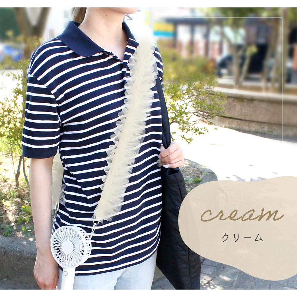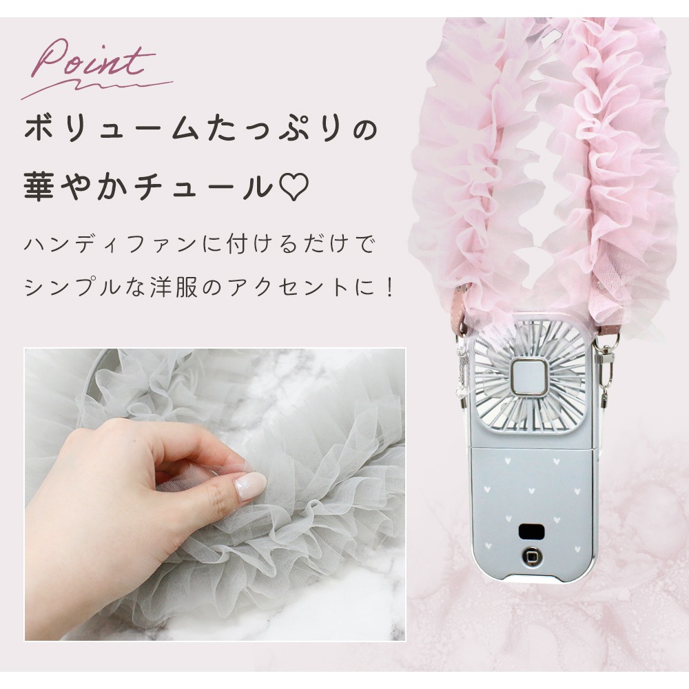ハンディファン チュールストラップ スマホストラップショルダー 小型 扇風機 肩掛け フリル 可愛い スマホ 太め ストラップ 首 ネックストラップ 長い おしゃれ