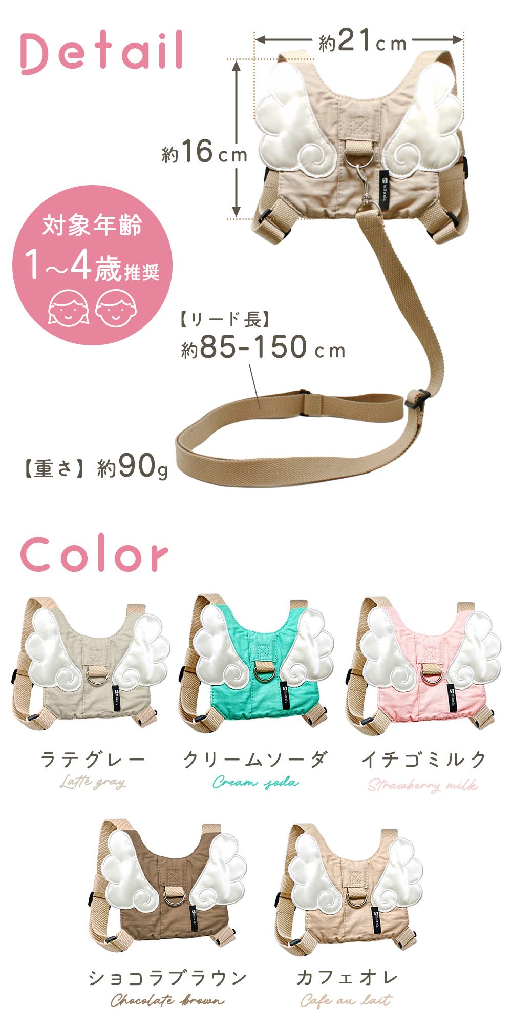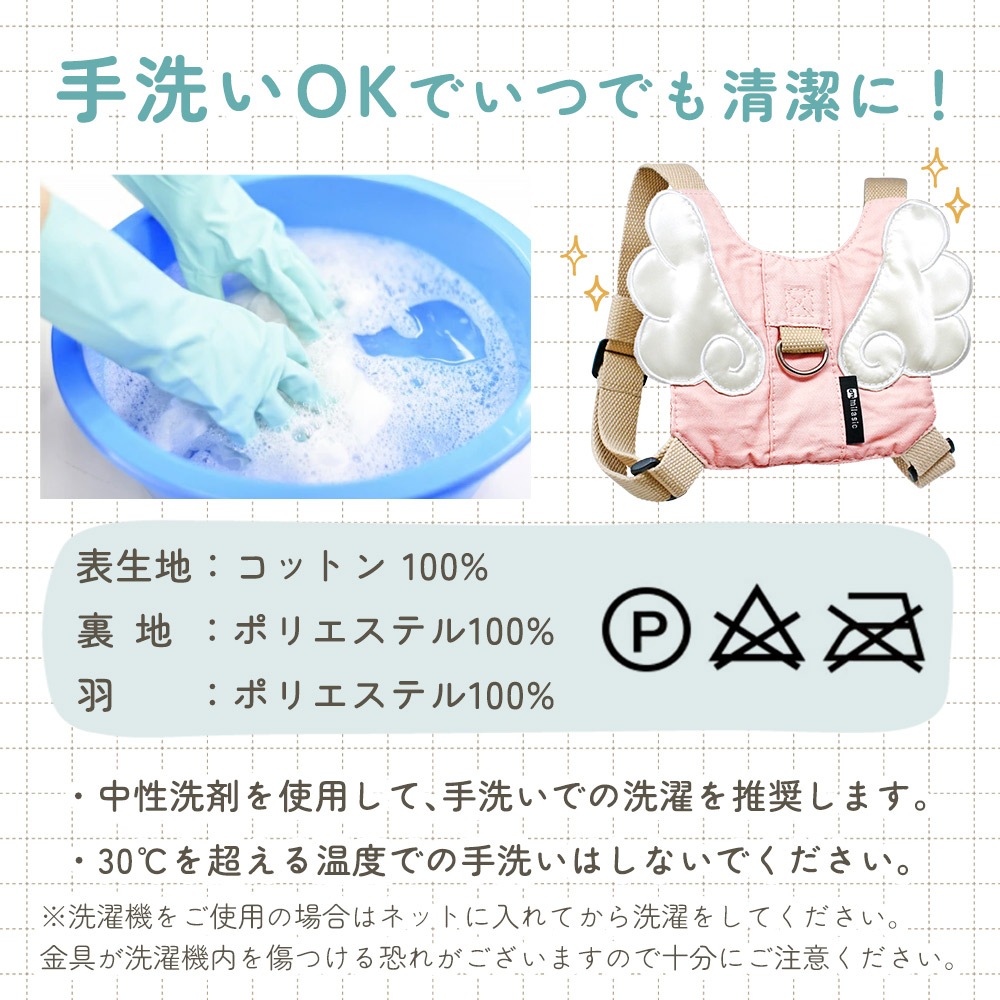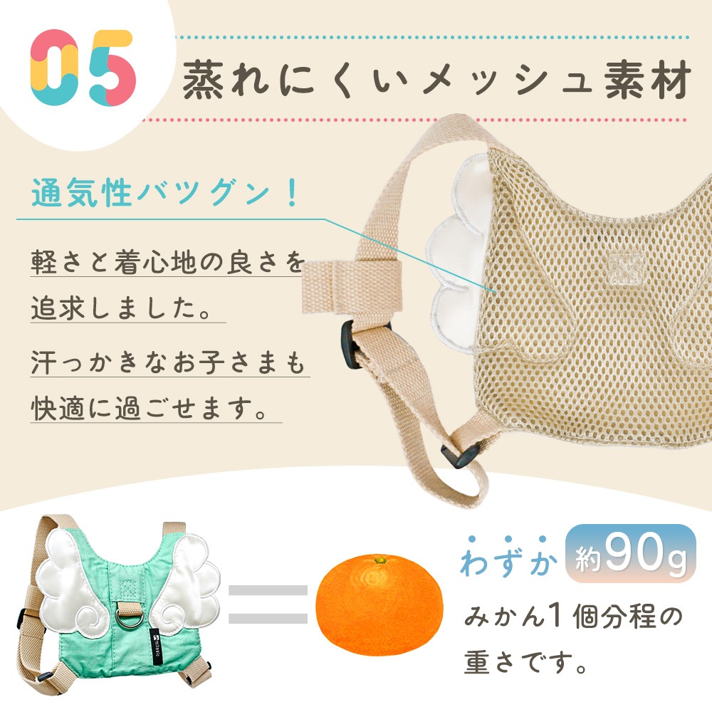 子供用に設計されたナビキッズハーネスは、軽量かつソフトな素材で幼児の身体にやさしくフィット。迷子防止紐は取り外し可能で、リュック単体としても使用可能。調節ベルト付きで1歳・2歳・3歳の成長に合わせて長く使用できます。