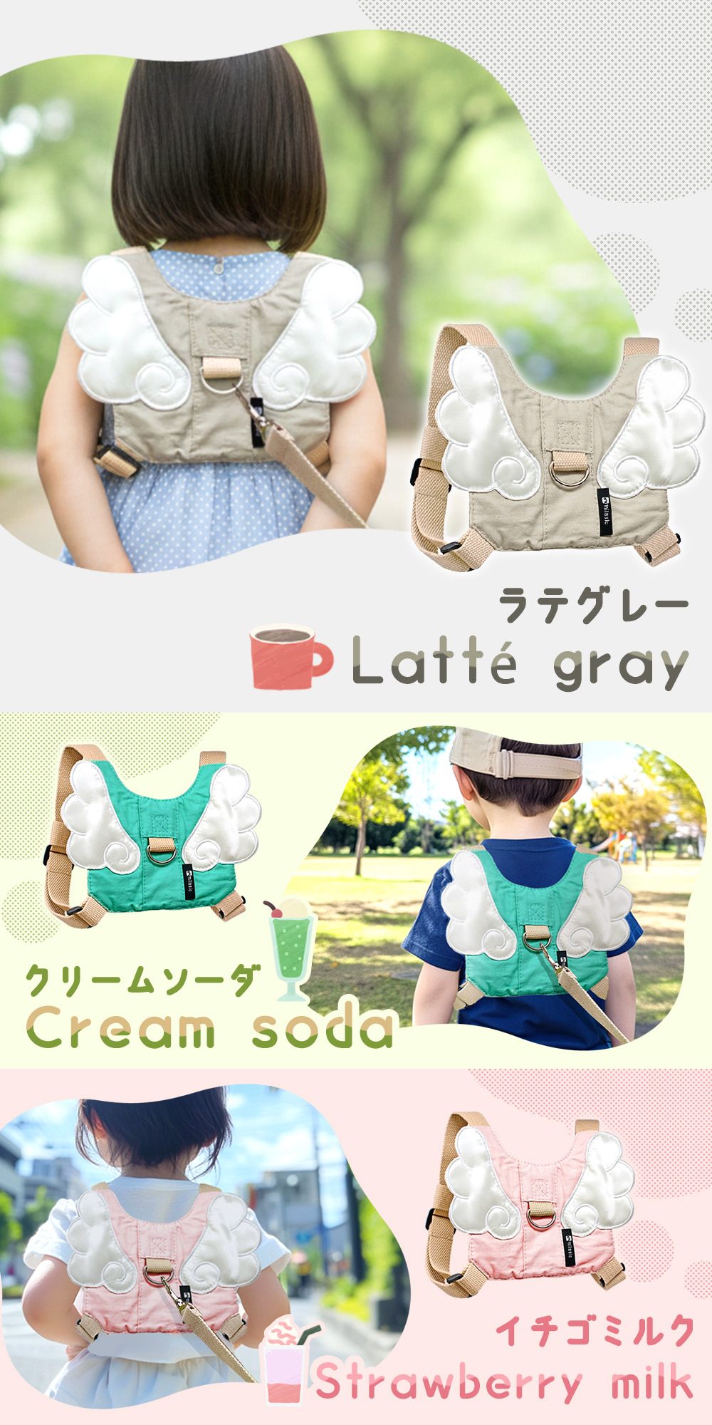 こどもが嫌がらずに身につけられる、おしゃれでかわいいリュック型のハーネス。男の子にも女の子にも似合うカラー展開で、ベビー用品の中でも特に人気のデザイン。ハーネス付きリュックとして、保育園・幼稚園の通園や家族とのお散歩にもぴったりです。
