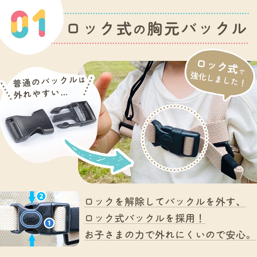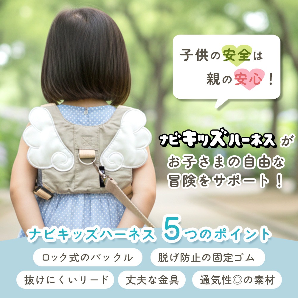ナビキッズハーネスは、1歳・2歳・3歳の幼児期に欠かせない飛び出し防止・迷子対策グッズ。元気いっぱいの男の子や女の子のおでかけに最適なキッズハーネスです。セーフティーハーネス仕様で、安全ベルトがしっかりと身体を支え、公園・旅行・帰省・通園時にも安心して使用できます。