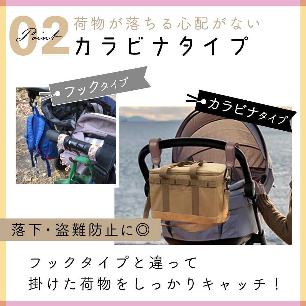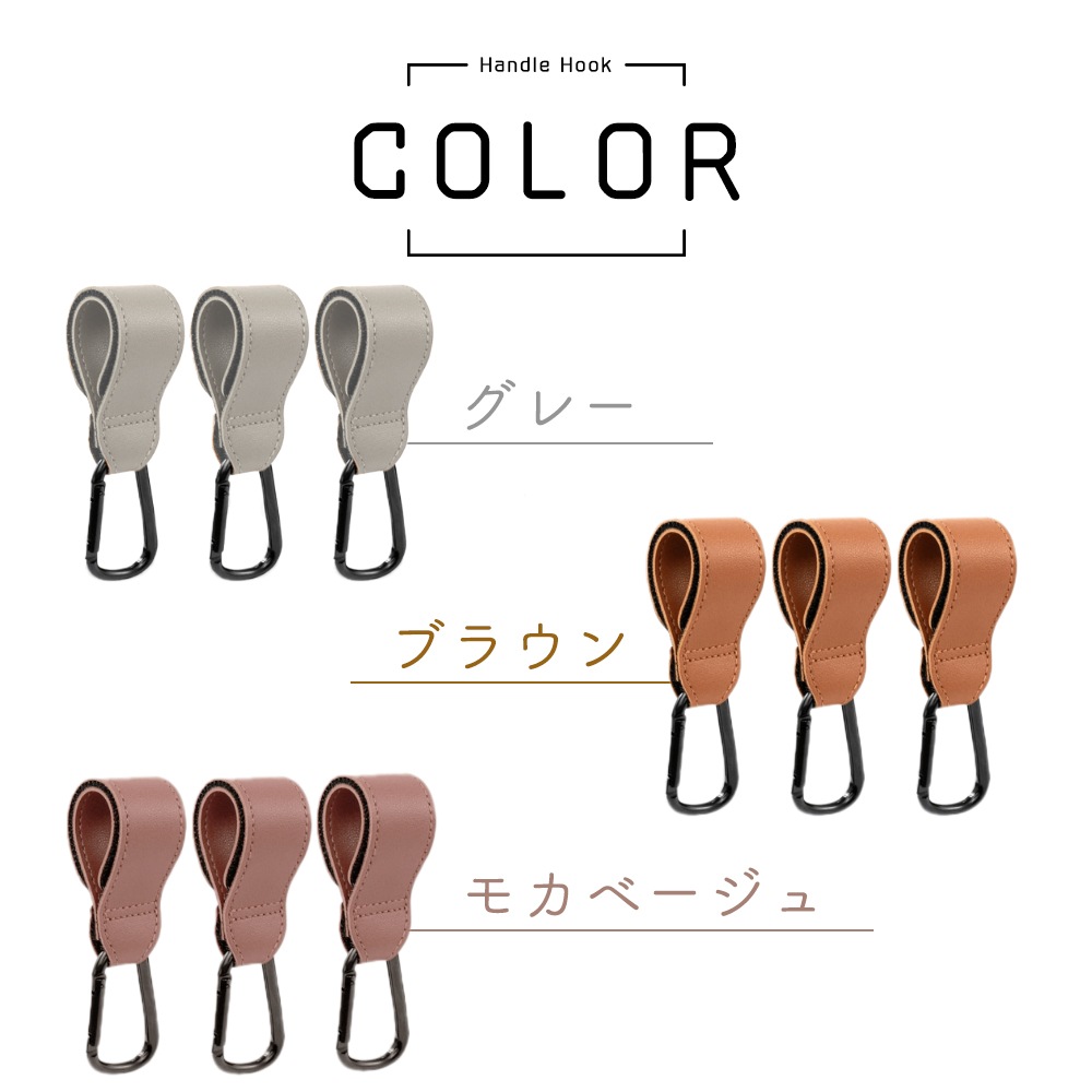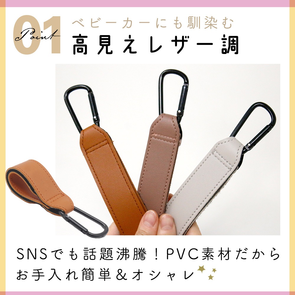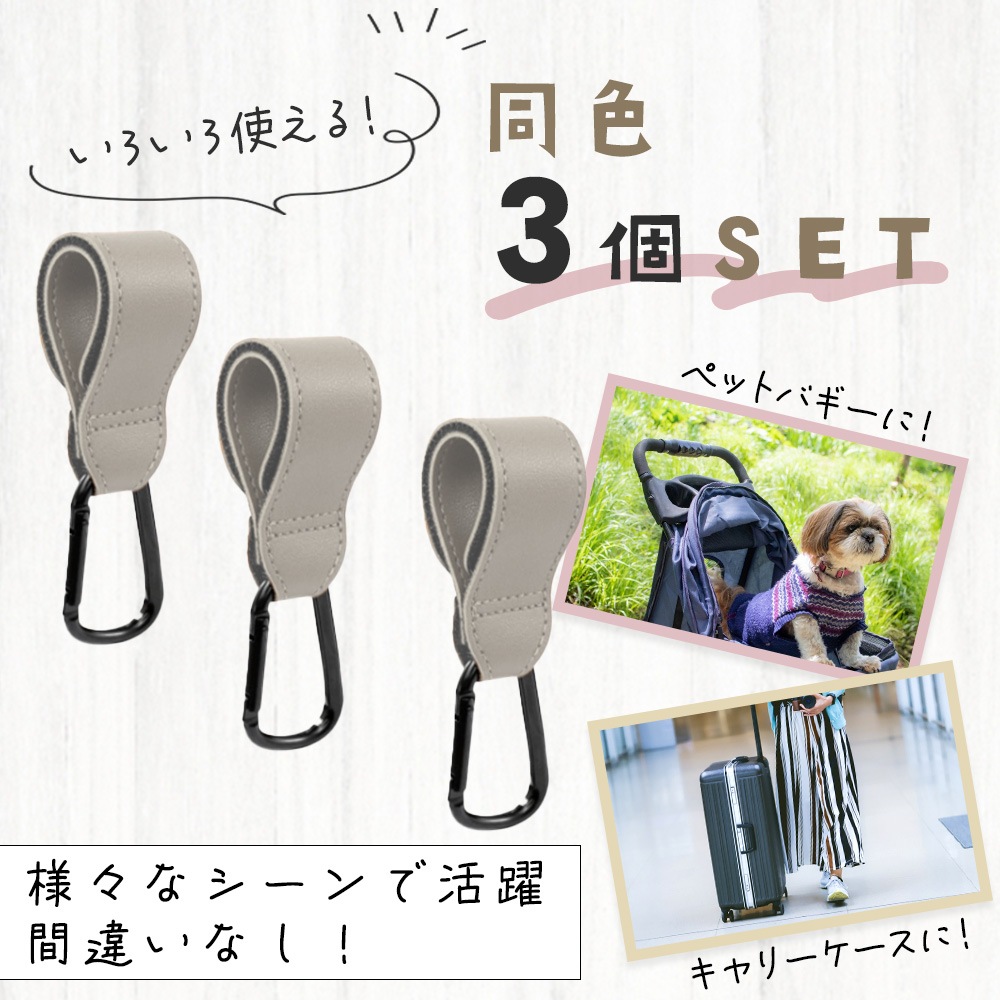 ベビーカーフック 3個セット マジックテープ カラビナ レザー調 おしゃれ かわいい バギーフック スタンダード 荷物掛け ペットバギー フック お出かけ 散歩