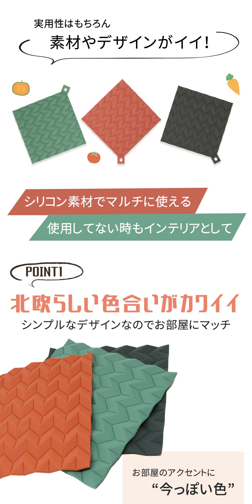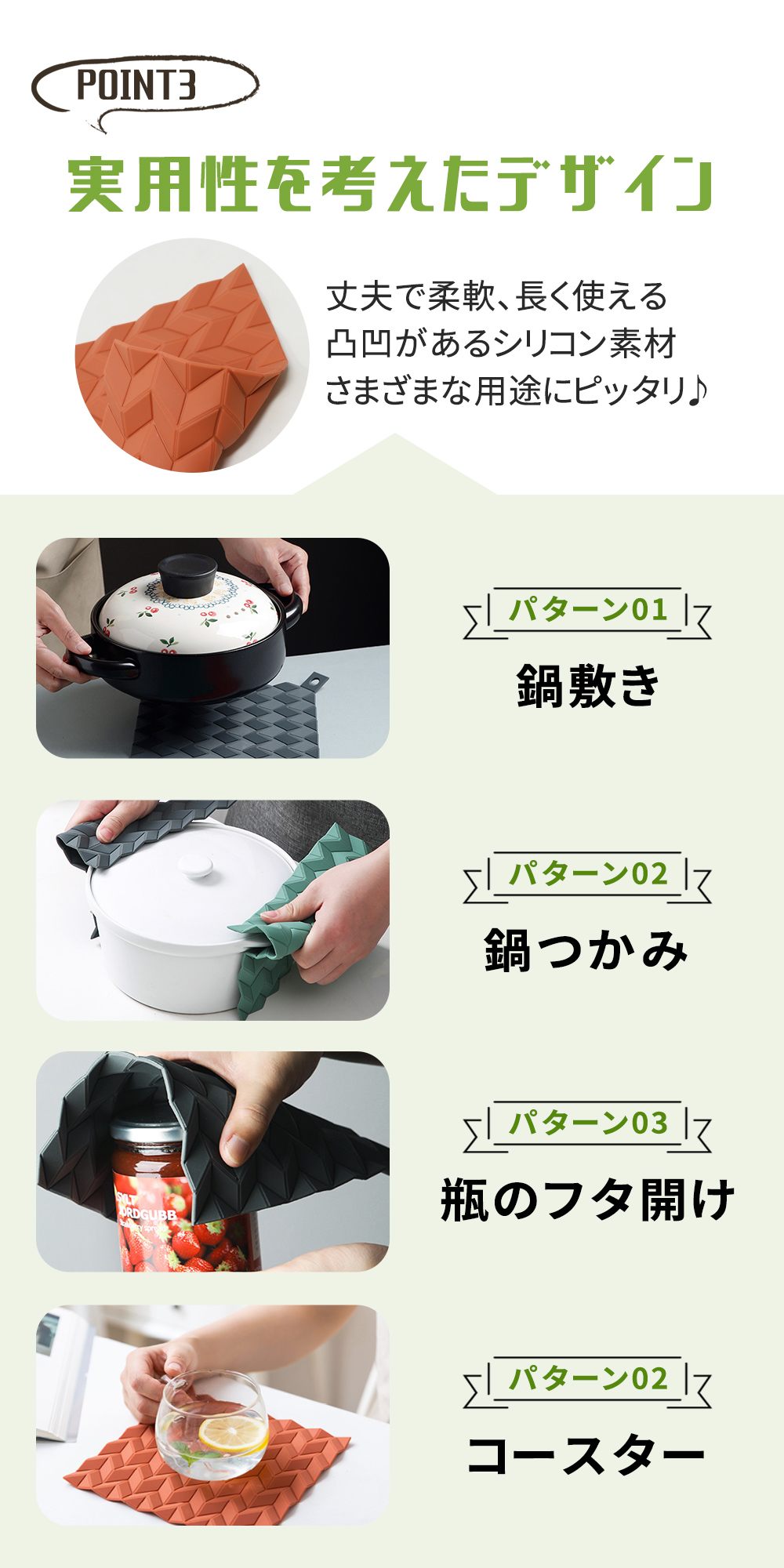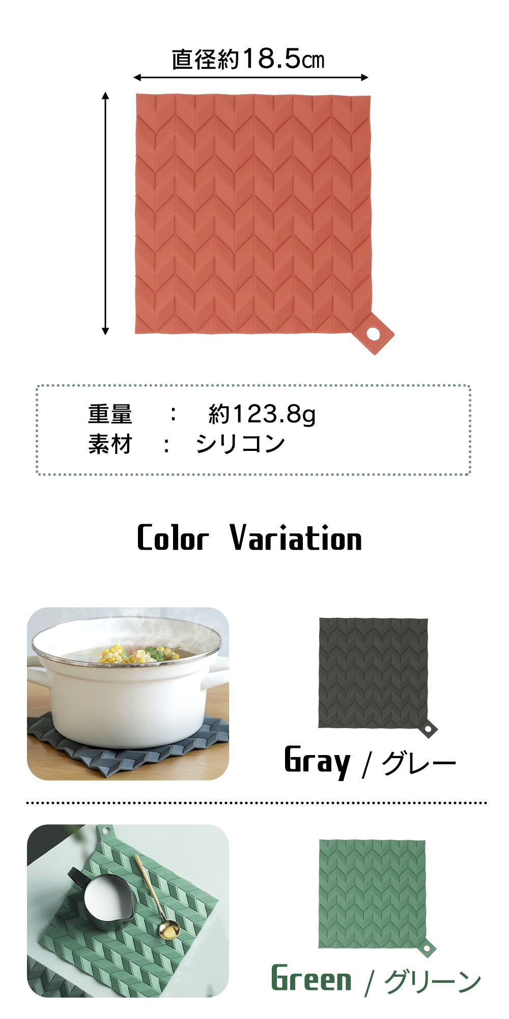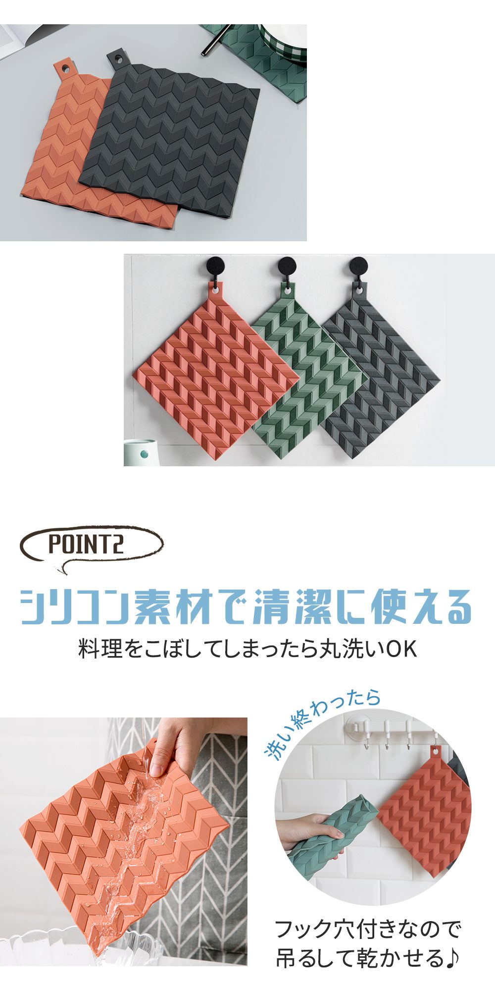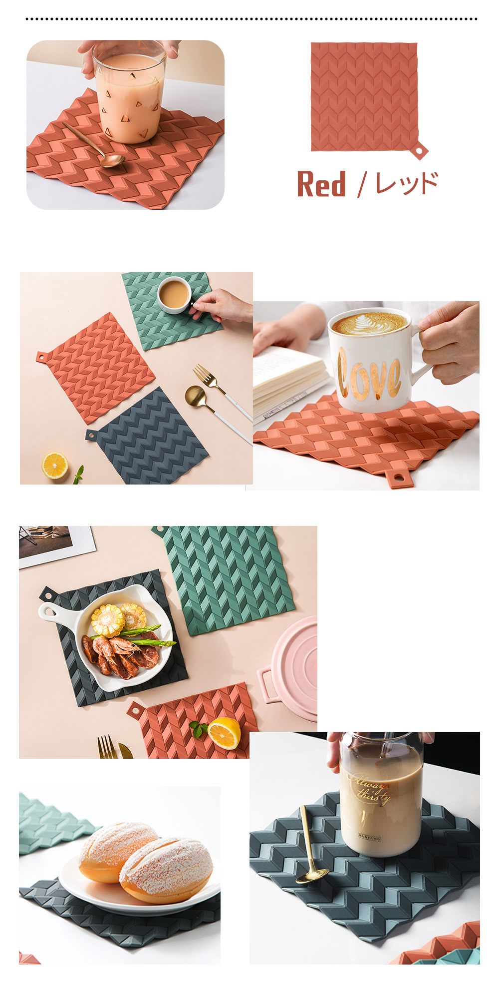 鍋敷き/鍋/なべ/なべ敷き/なべしき/北欧風/耐熱/防水/鍋つかみ/コースター/ランチョンマット/ランチョン/マット/シンプル/デザイン/シンプルデザイン/保温性/保温/持続/熱持続/おしゃれ/かわいい/くすみ/くすみカラー/弾く/撥水/洗える/お手入れ/お手入れ簡単/フック/フック穴/蓋開け/瓶/ジャム/レッド/グリーン/グレー/シリコン鍋敷き/四角/鍋置き/キッチン/ダイニング/机/テーブル/キッチングッズ/滑り止め/ポットマット