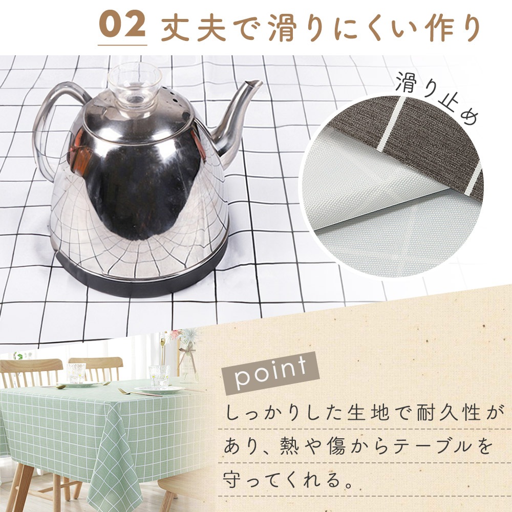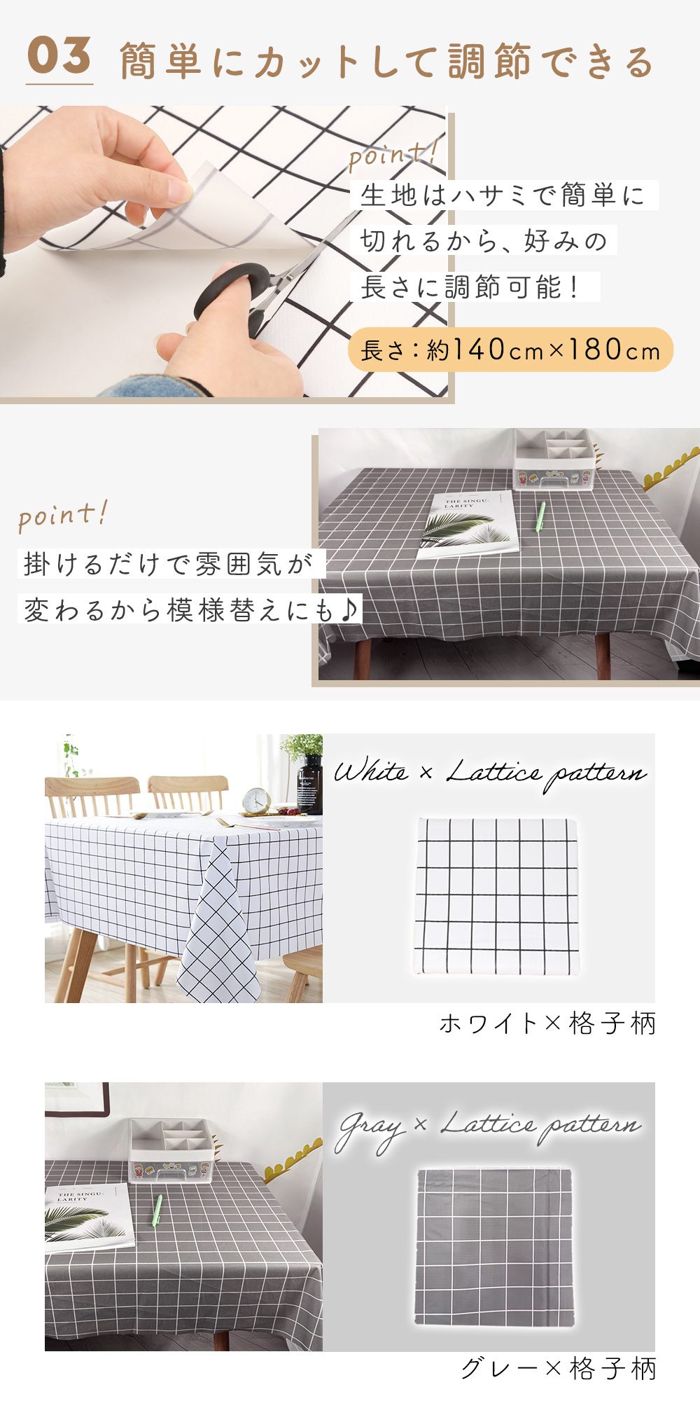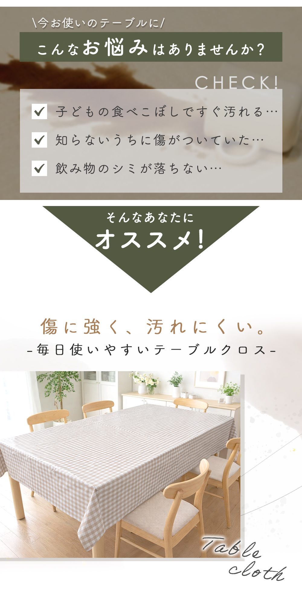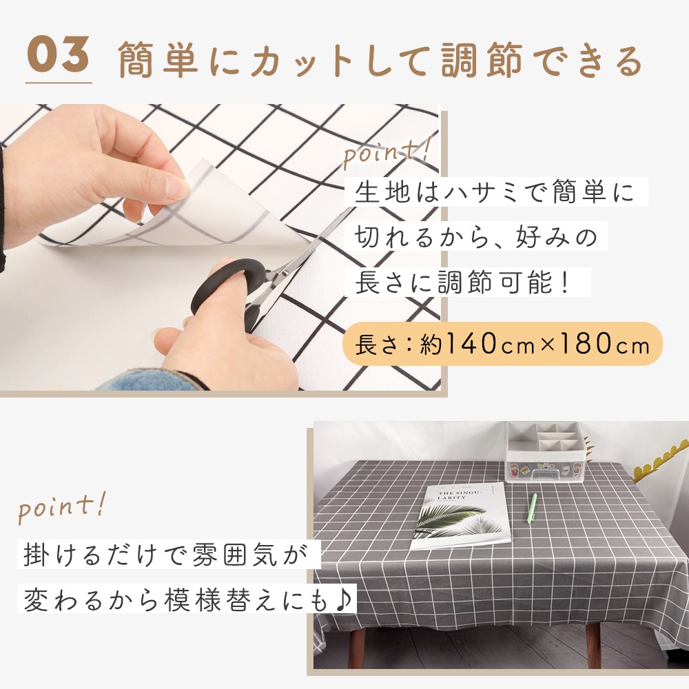約140×180cmの長方形サイズで、そのまま使うのはもちろん、ハサミでカットしてテーブルサイズに合わせて長さ調節も可能です。北欧風の格子柄やチェック柄が、ダイニングをすっきりおしゃれな印象に見せてくれるのもポイント。家庭のインテリアになじみやすく、モダンでおしゃれなダイニング空間づくりにもおすすめです。