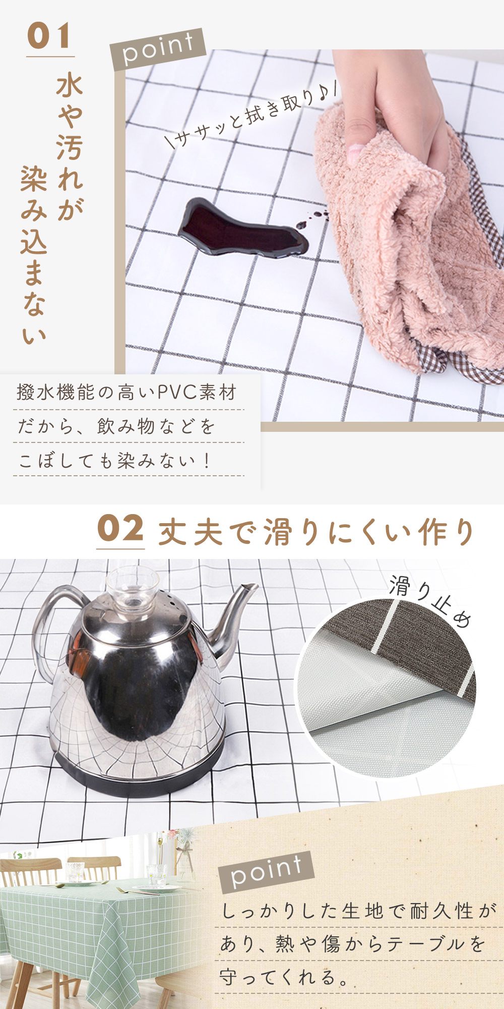 撥水加工を施したPVC素材を使用しているため、飲み物や食べこぼしが染み込みにくく、毎日の食卓を清潔に保ちやすいのが特長です。ビニールテーブルクロスとして水や汚れをサッと拭き取れるので、お手入れ簡単なテーブルカバーを探している方にもぴったり。汚れ防止や食卓カバーとして使いやすく、家庭用はもちろん、カフェやレストランにも取り入れやすいテーブルクロスです。