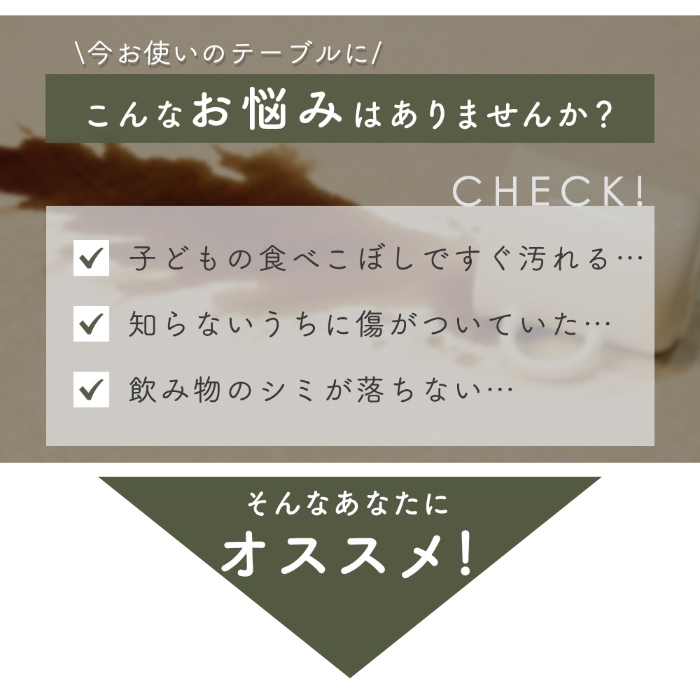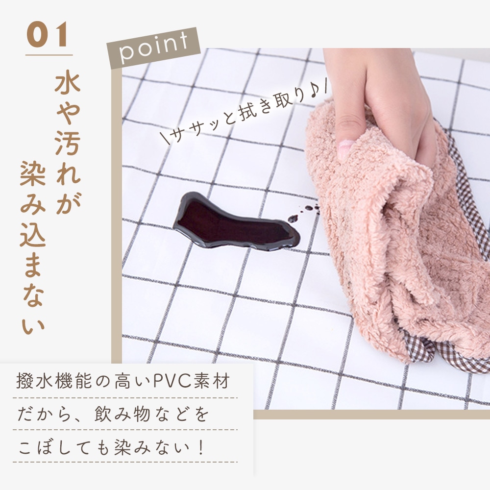 しっかりとしたPVC生地を使用しているため、食器や小物による擦れや傷を防ぎながら、テーブルをきれいに保ちやすくなっています。傷防止や汚れ防止だけでなく、耐熱性にも配慮されているので、毎日使うダイニングテーブルの保護にも便利です。テーブルマット感覚で取り入れやすく、大切な家具を長く使いたいご家庭にもおすすめです。