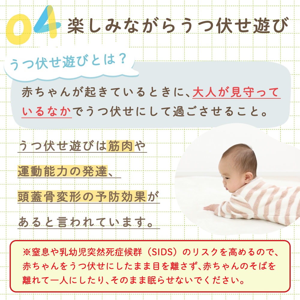 腹ばいの姿勢で首や背中の筋肉を鍛えることで、寝返りやはいはいへのステップにもつながります。