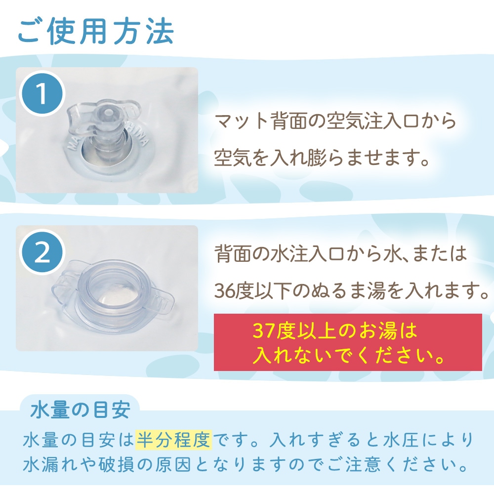 マット内部に水を入れて使用する仕様ですが、外側は密閉されているため濡れることなく