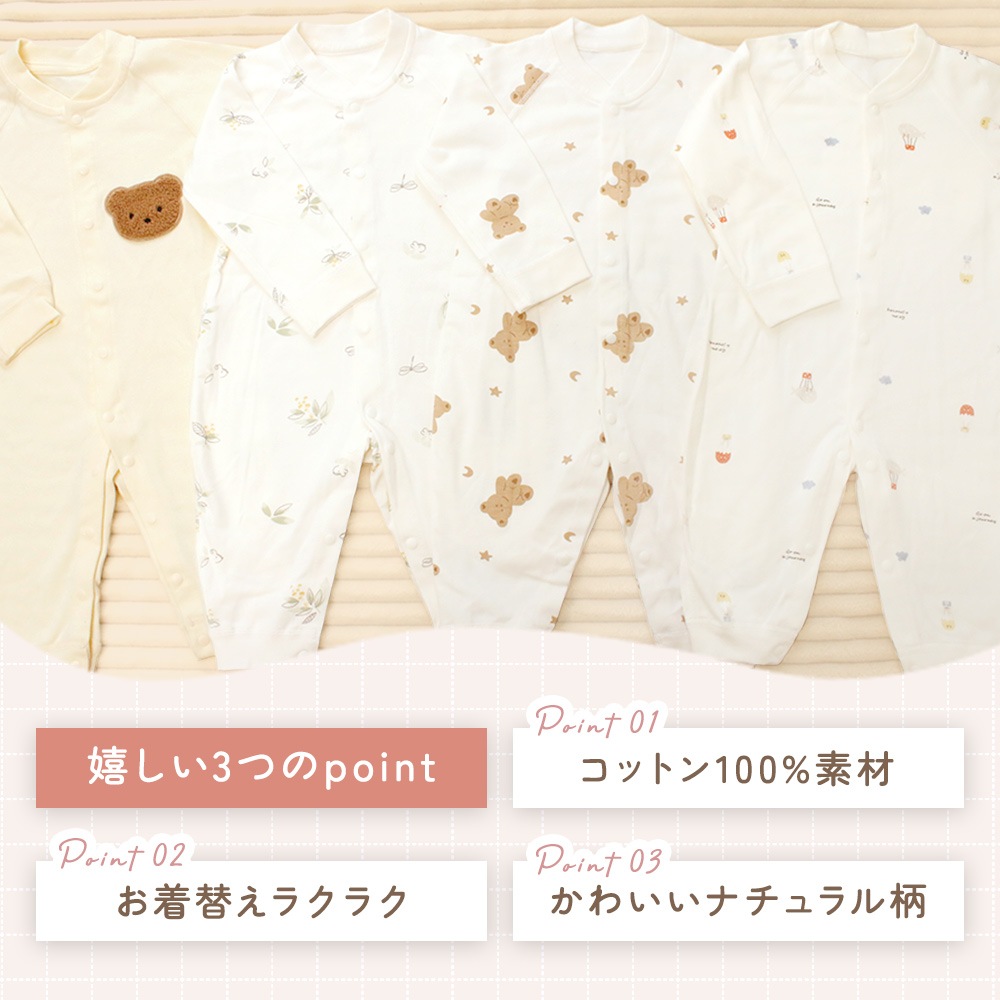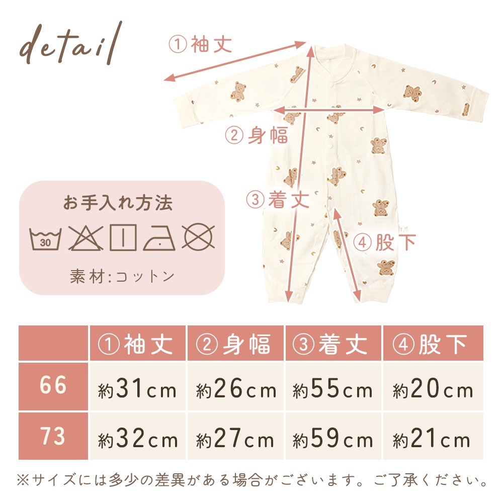ロンパース 前開き ベビー 長袖 冬 カバーオール 上下 男の子 女の子 綿 コットン100% ベビー服 66 73cm フロントボタン かわいい 足つき 長ズボン お昼寝