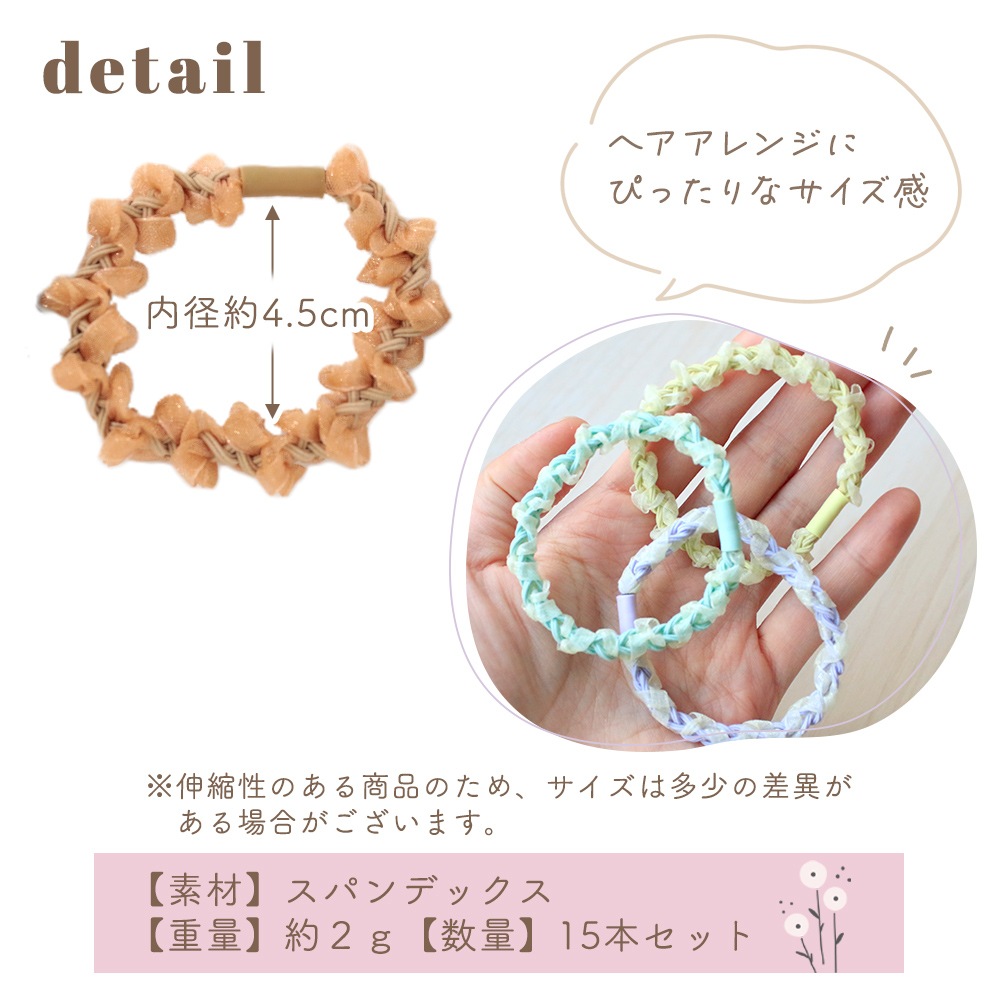 ヘアゴム/15本セット/オーガンジー/生地/透け感/シースルー/まとめ買い/レース/おしゃれ/かわいい/髪飾り/シンプル/華やか/カラフル/痛くない/ポニーテール/跡がつかない/絡まない/まとめ髪/卒園式/卒業式/入学式/入園式/学校/お団子ヘア/ヘアアレンジ/髪ゴム/大人っぽい/プレゼント/贈り物/細め/伸びる/大人/子供/カジュアル/ヘアアクセサリー/飾りゴム/からまない/仕事/職場/オフィス/TN-OGHT/