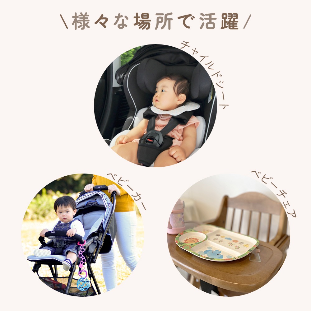 チャイルドシートはもちろん、ベビーカーやベビーチェア、旅行時のポータブルシートとしても便利。