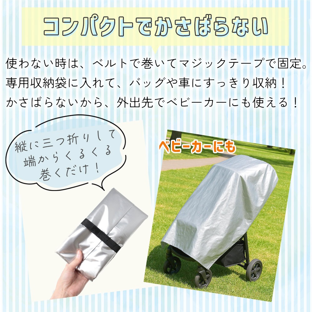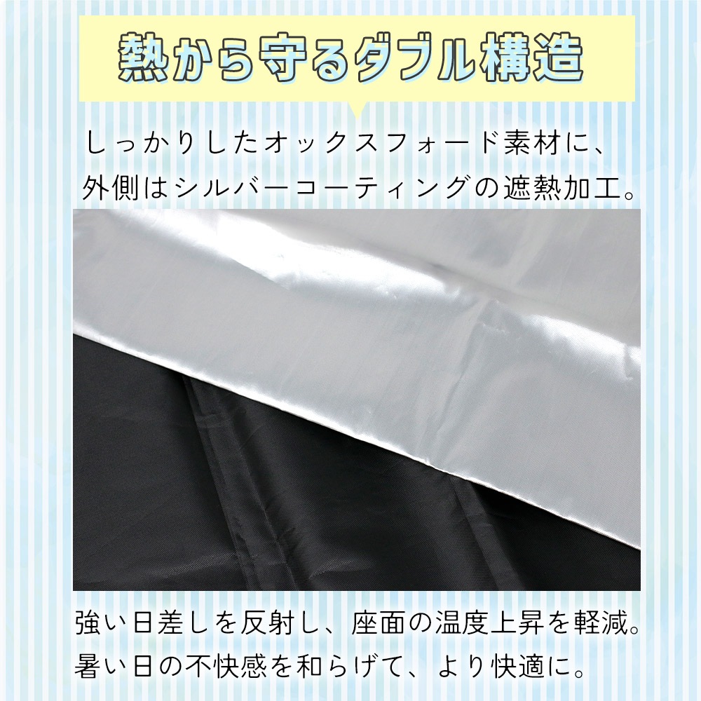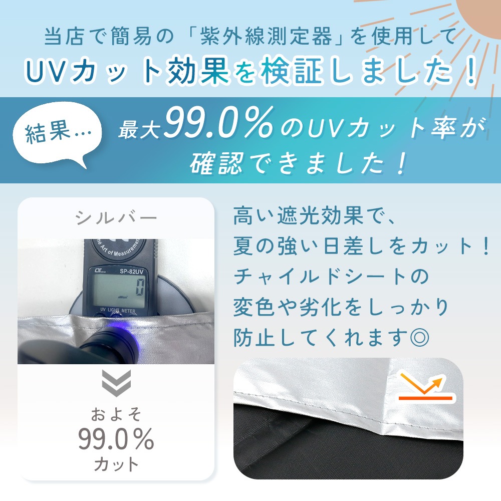二重構造のアルミフィルムを採用し、強い太陽熱や紫外線からチャイルドシートをしっかり遮断。