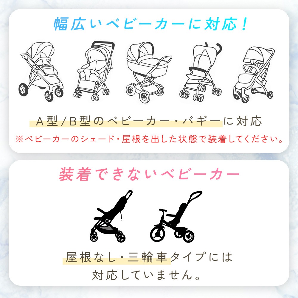 ワンタッチで簡単に取り付けられる仕様で、a型・b型・ab型など多様なベビーカーに対応しています。