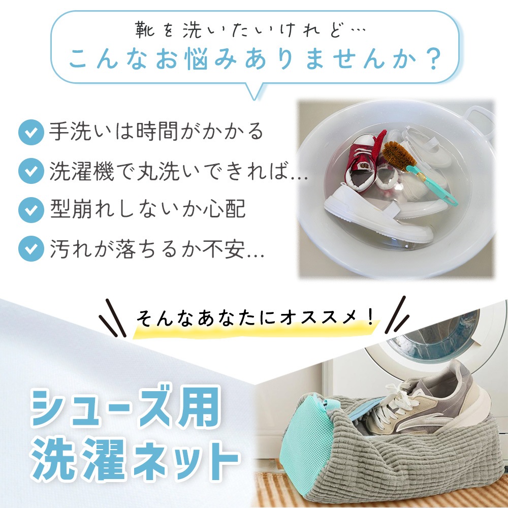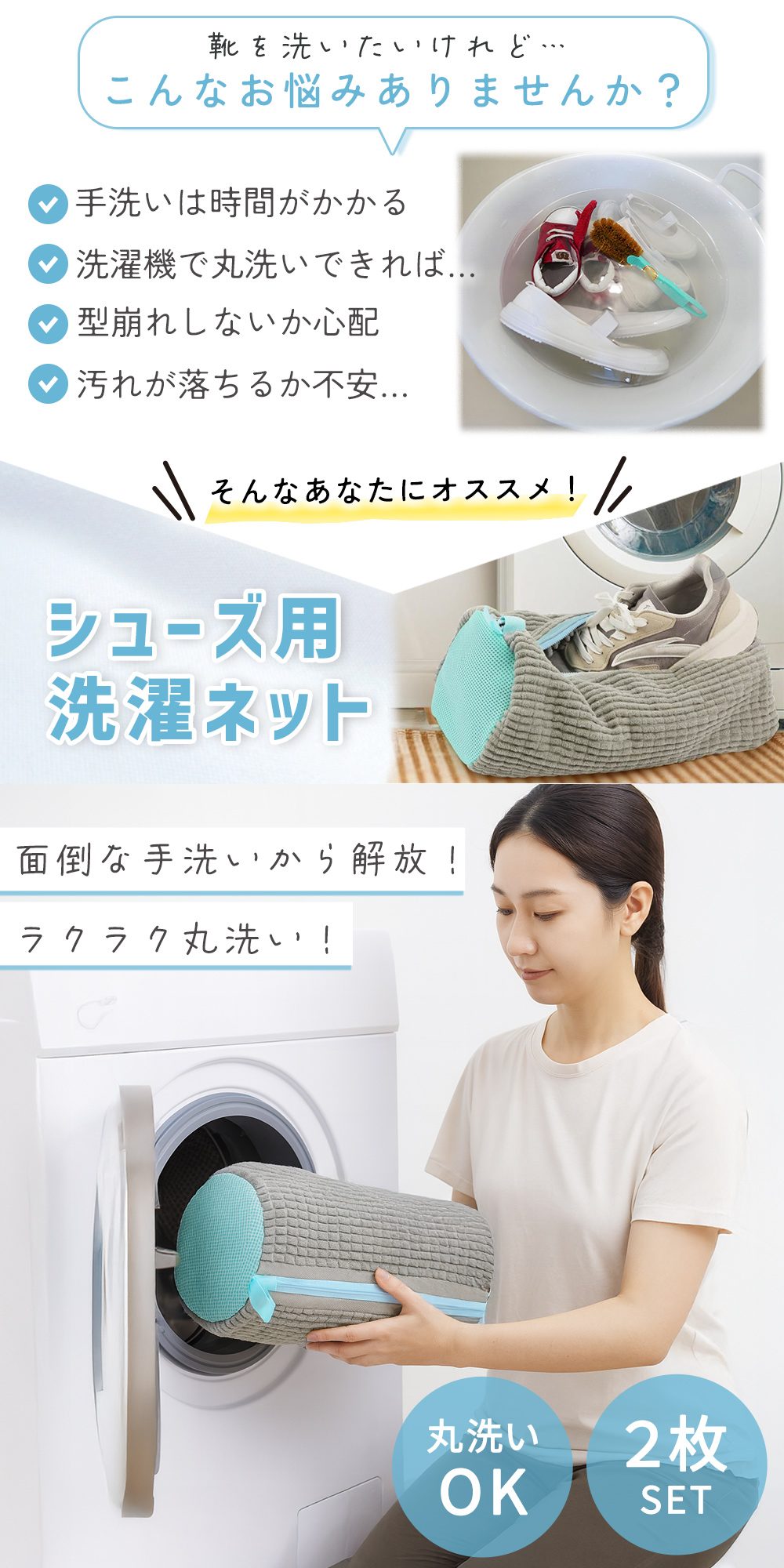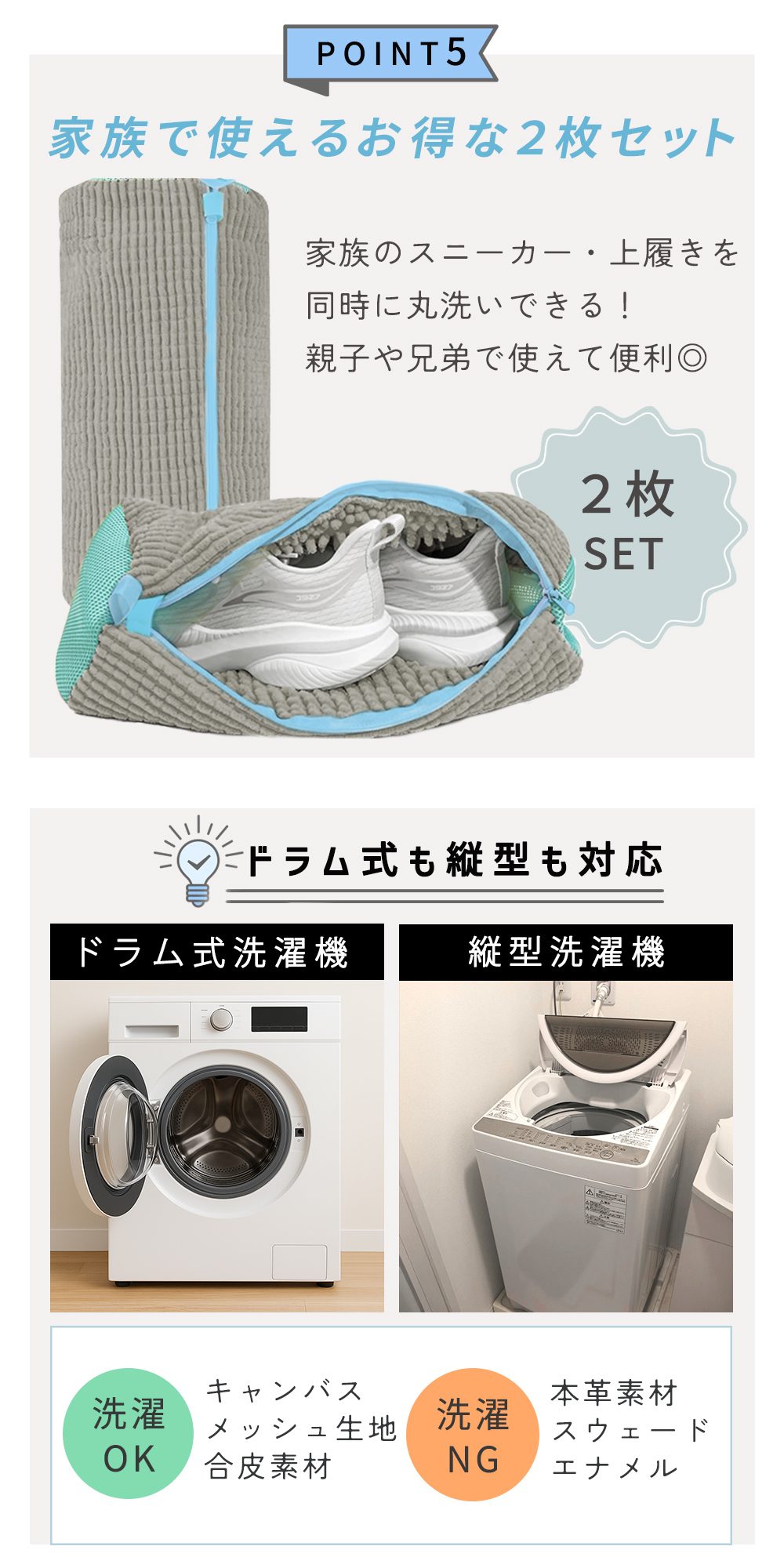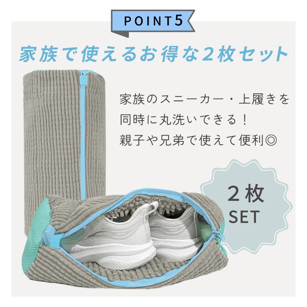 2枚セットなので兄弟や親子で同時に使え、学校用や部活動用の靴をまとめて洗えます。メンズ・レディース・キッズまで幅広く対応できる洗濯便利グッズです。