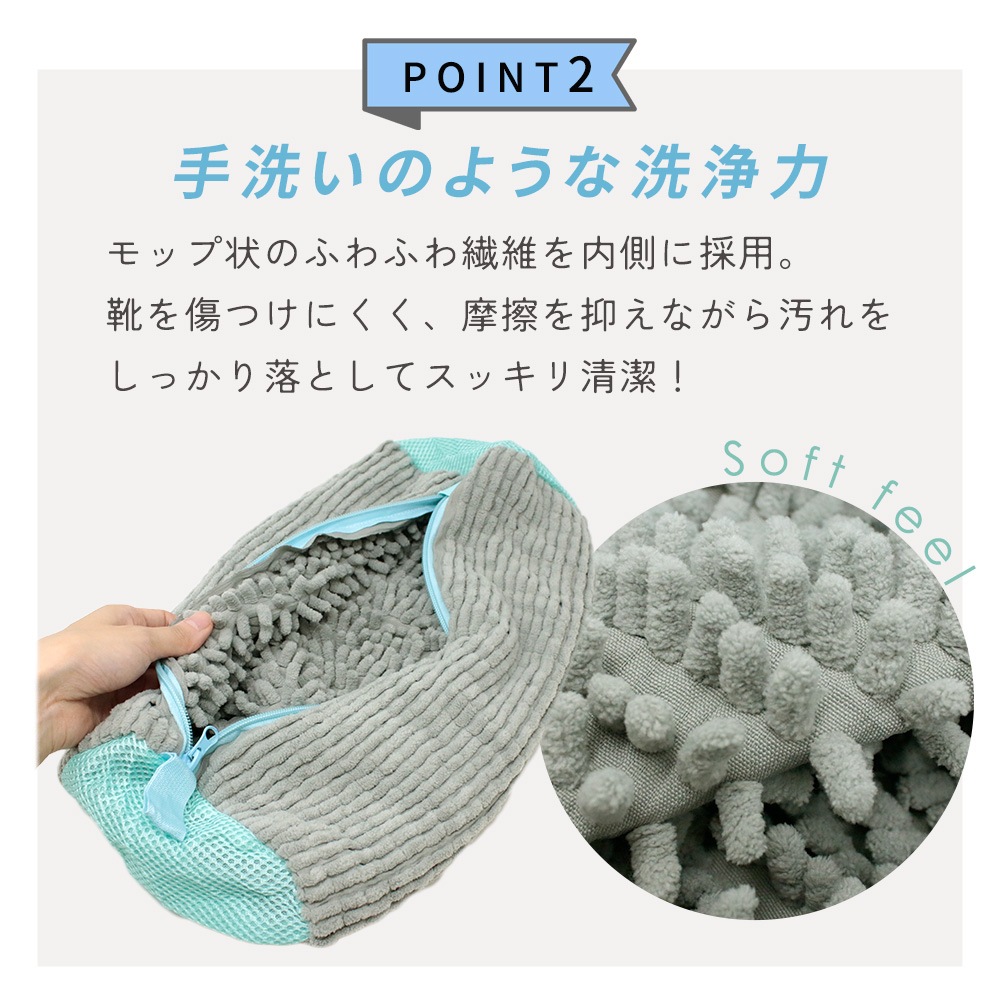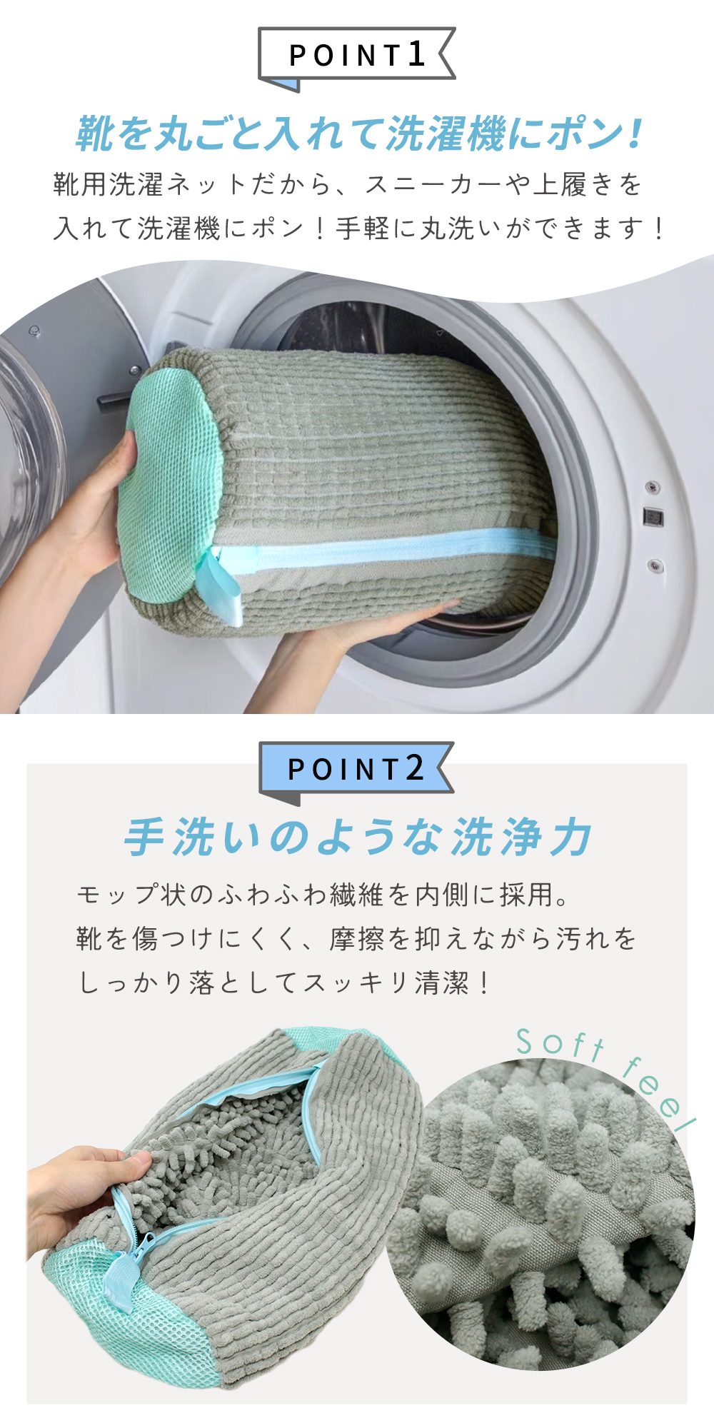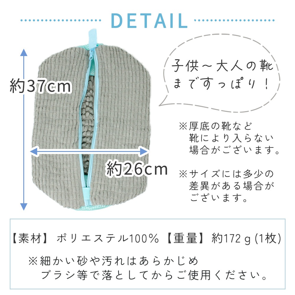 スニーカー、上履き、上靴、サンダル、スリッパなど様々な靴を丸洗いできる靴用洗濯ネットです。モップ状のふわふわ繊維が汚れをしっかりキャッチし、手洗い不要で簡単にお手入れできます。