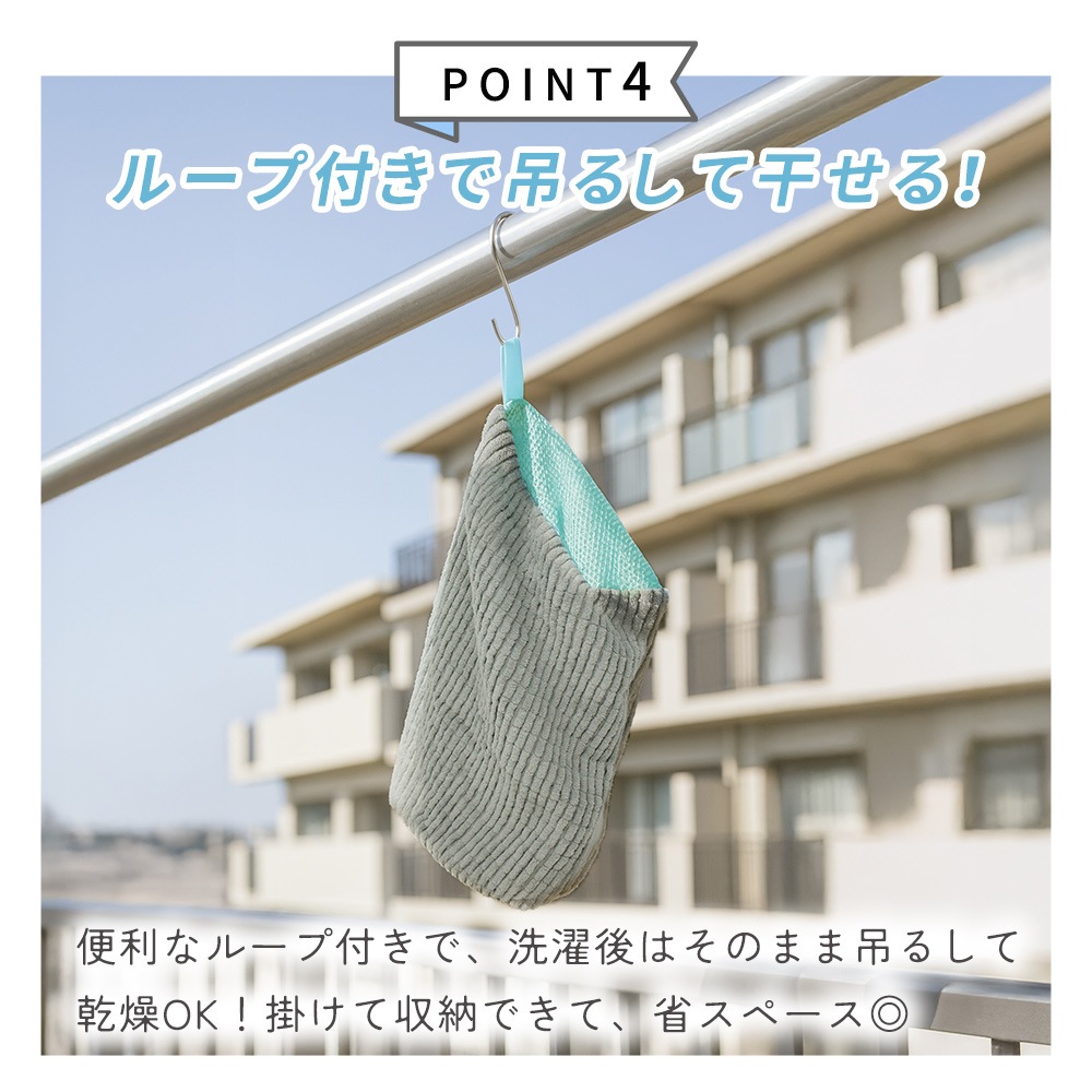 ループが付いているので洗濯後はそのまま吊るして干せます。収納にも便利で、ランドリーネットとしても活躍。時短アイテムとして毎日の洗濯をサポートします。