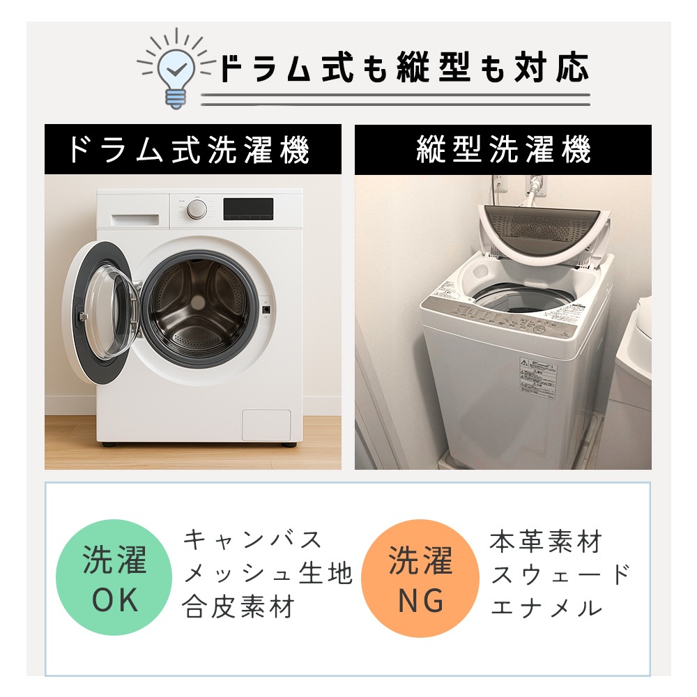 ドラム式・縦型洗濯機の両方に対応しており、家庭の洗濯機で安心してご使用いただけます。キャンバスや合皮素材の靴にも対応し、泥よごれや汗による汚れもすっきり落とせます。