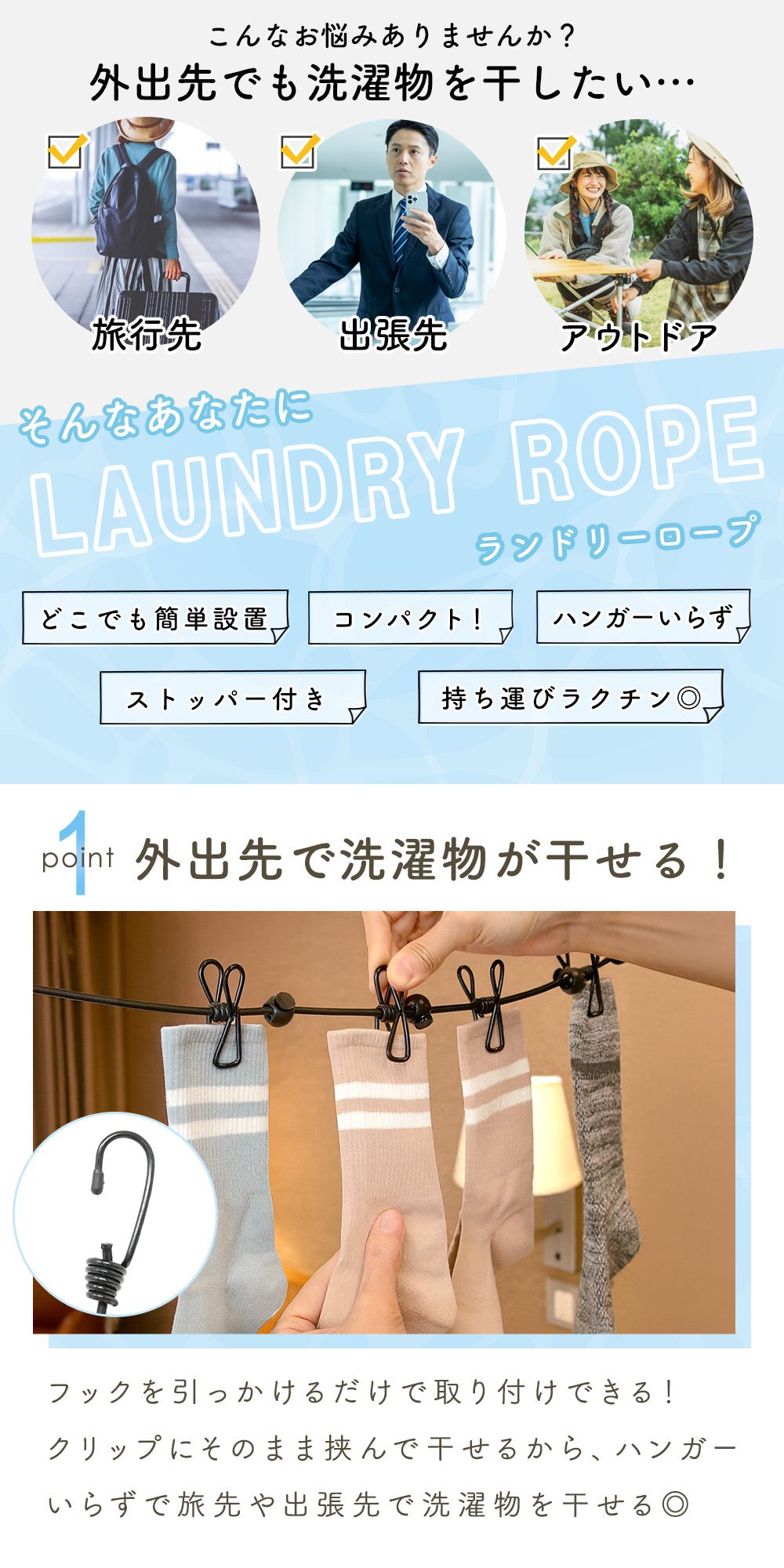 両端にはフックが付いており、カーテンレールやポール、木の枝などに引っ掛けるだけで設置完了。工具不要でどこでもすぐに使えるため、急な部屋干しや旅行先、アウトドアでも大活躍します。