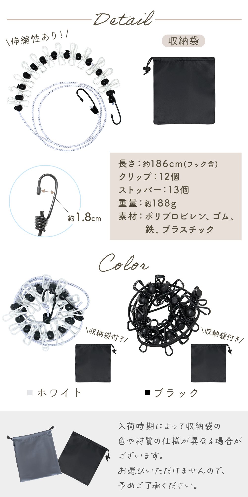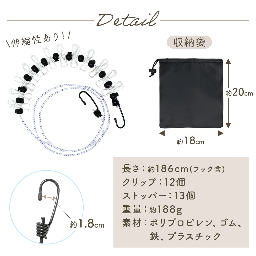 ランドリーロープ 収納袋付き コンパクト 部屋干し 簡易物干し 旅行 出張 クリップ12個 ズレ防止 ストッパー 引っ掛けフック式 伸縮性ゴム 軽量 携帯 レジャー