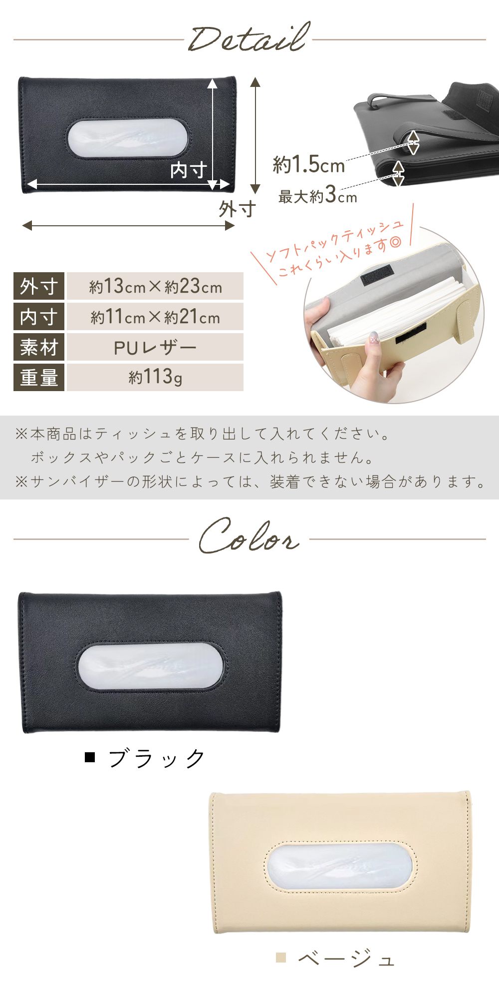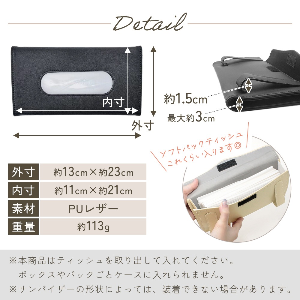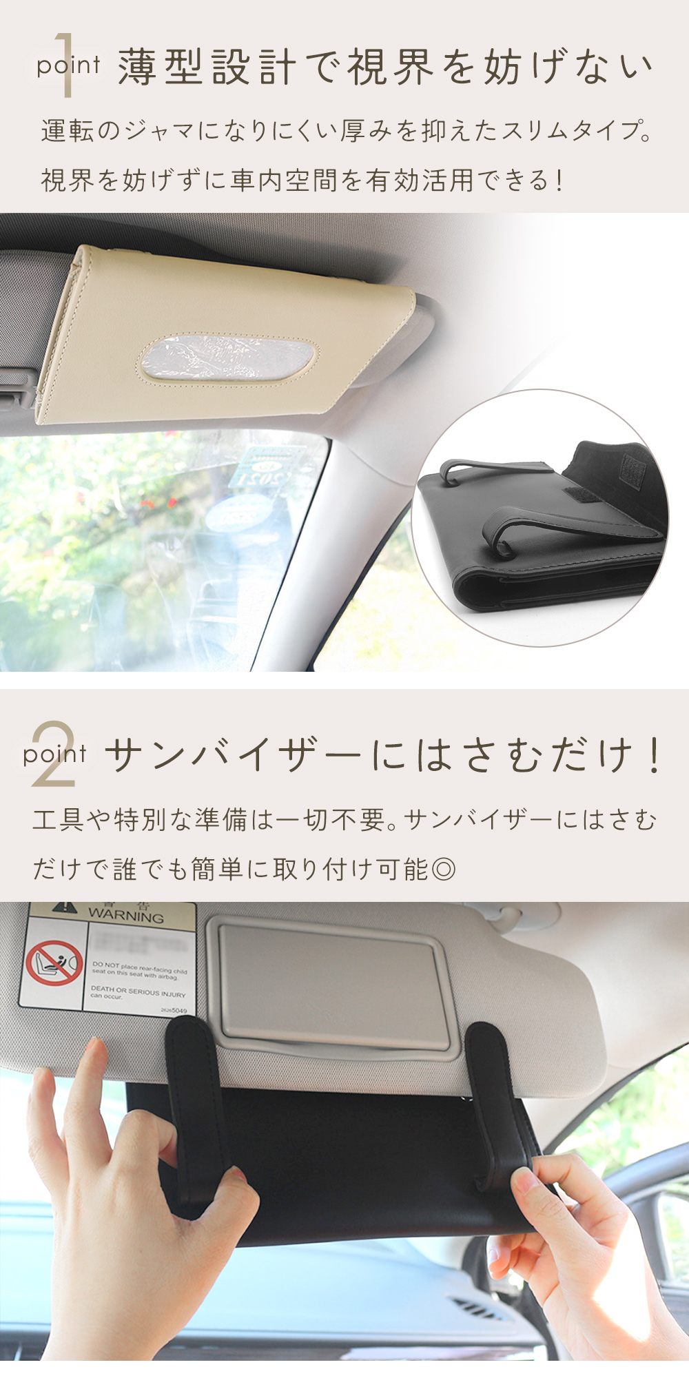 車内でティッシュの置き場に困っていませんか?本製品はサンバイザーに挟むだけで簡単に取り付けられるティッシュケース。視界を妨げない薄型設計で、ドライブ中も快適に使用できます。