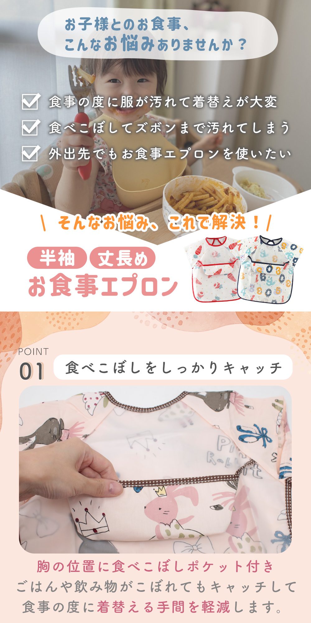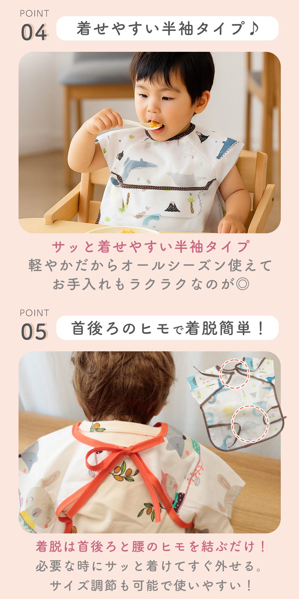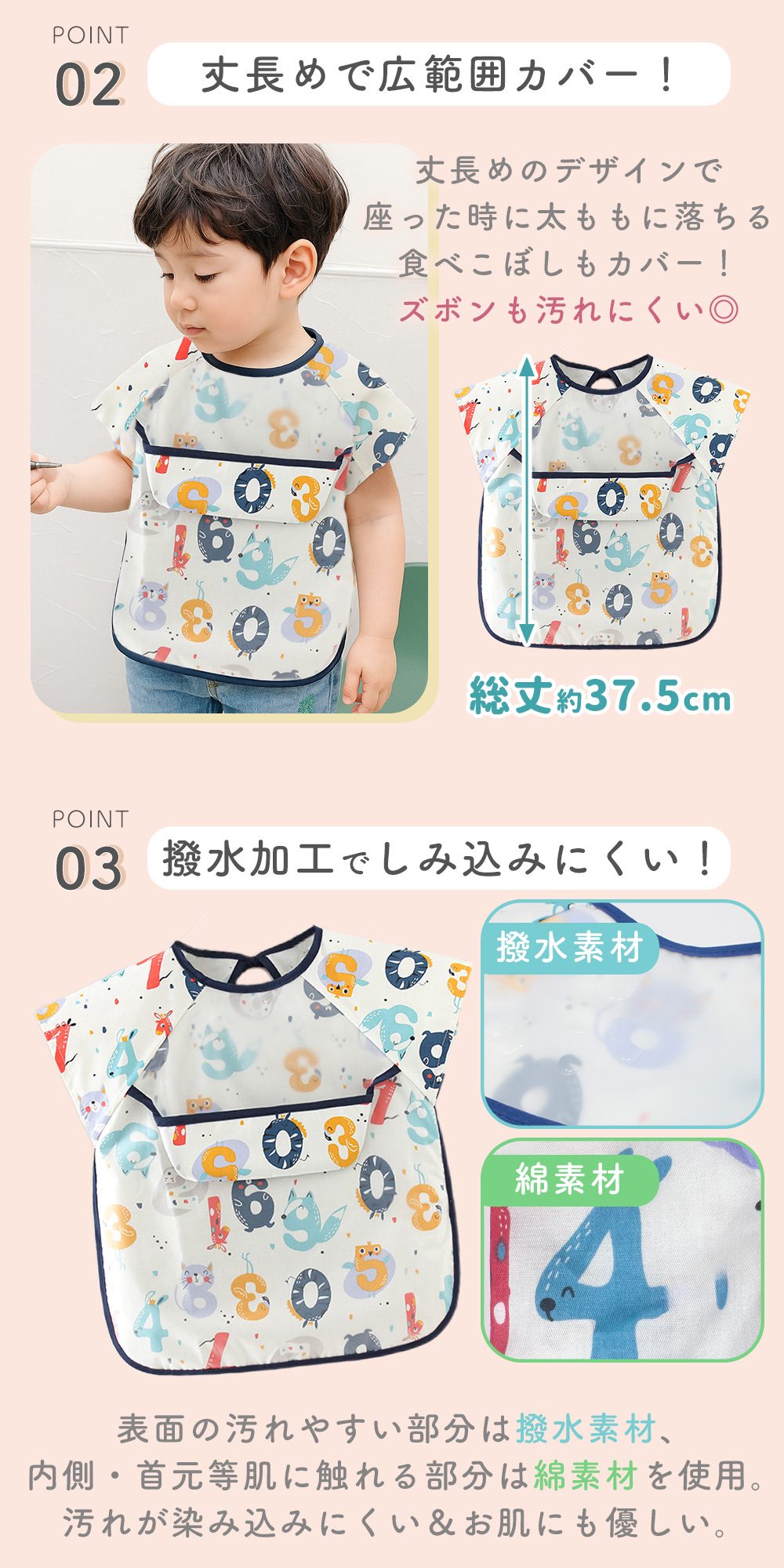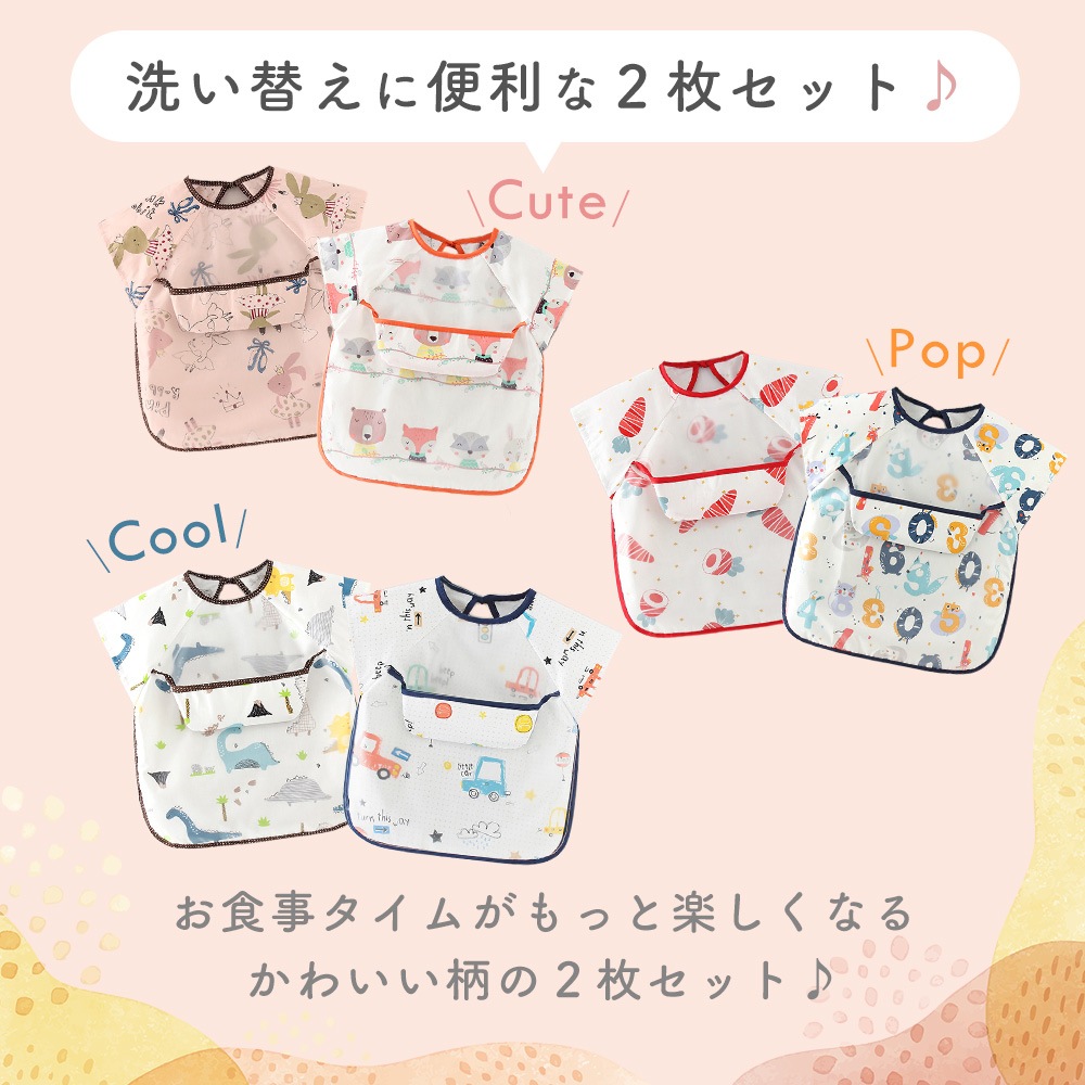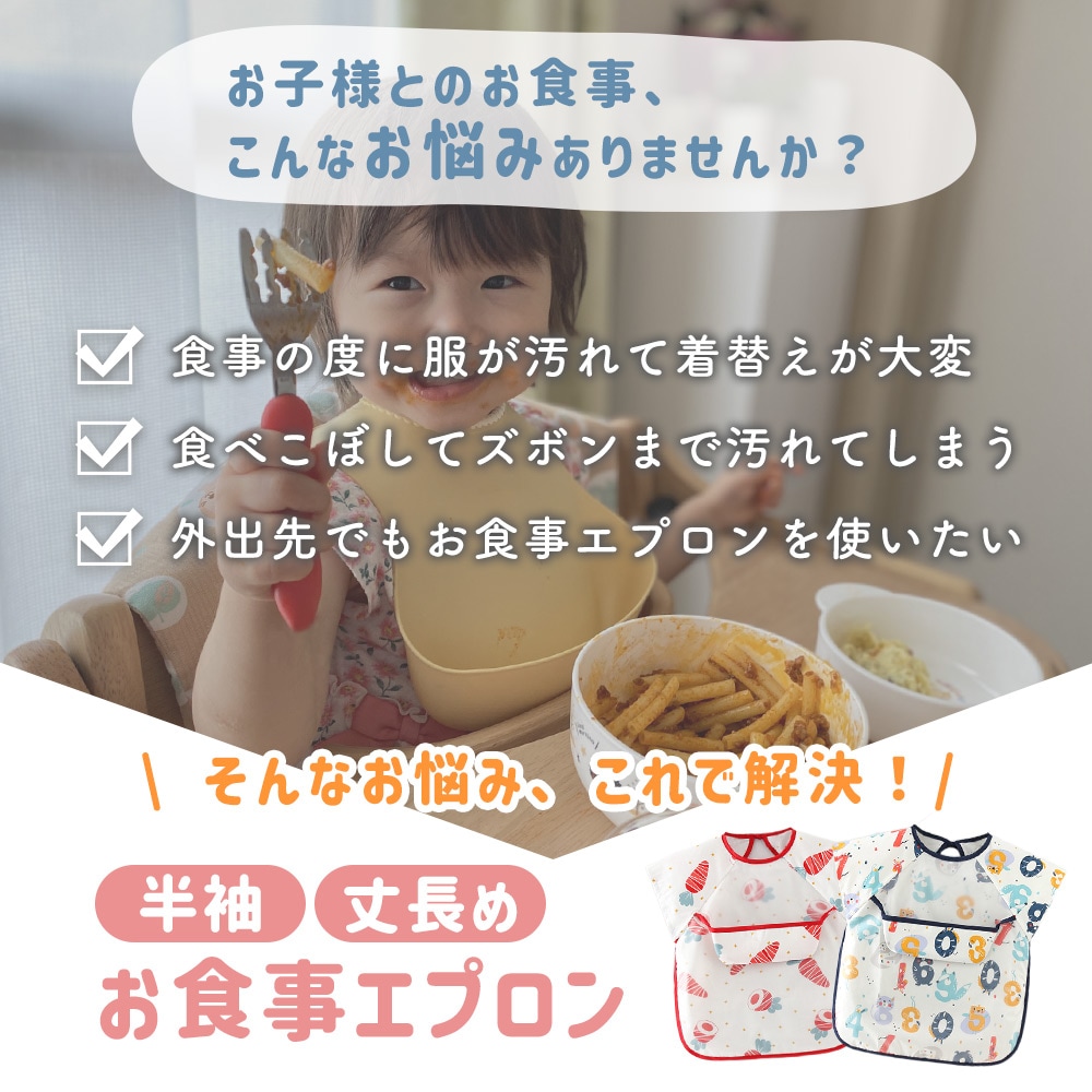 お食事エプロン 半袖 丈長め 2枚セット ベビーエプロン 2枚 長め 半袖 スタイ ベビー ベビースタイ おしゃれ かわいい 撥水 紐 ヒモ 調整可 食べこぼし 子ども