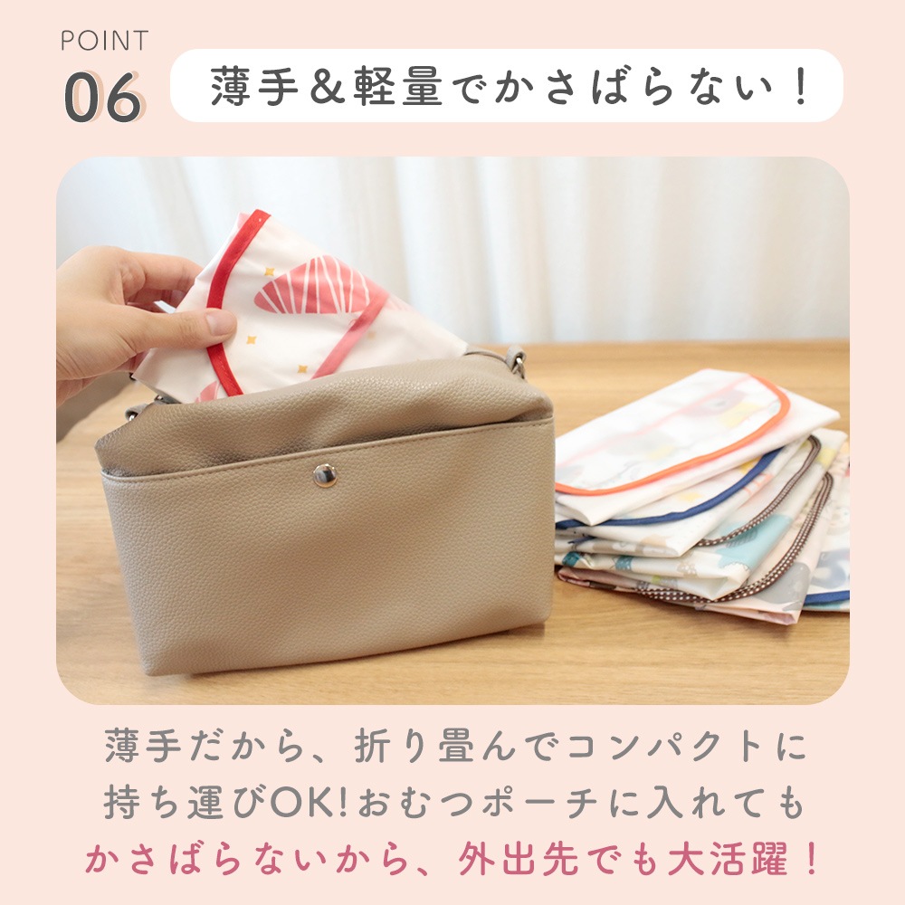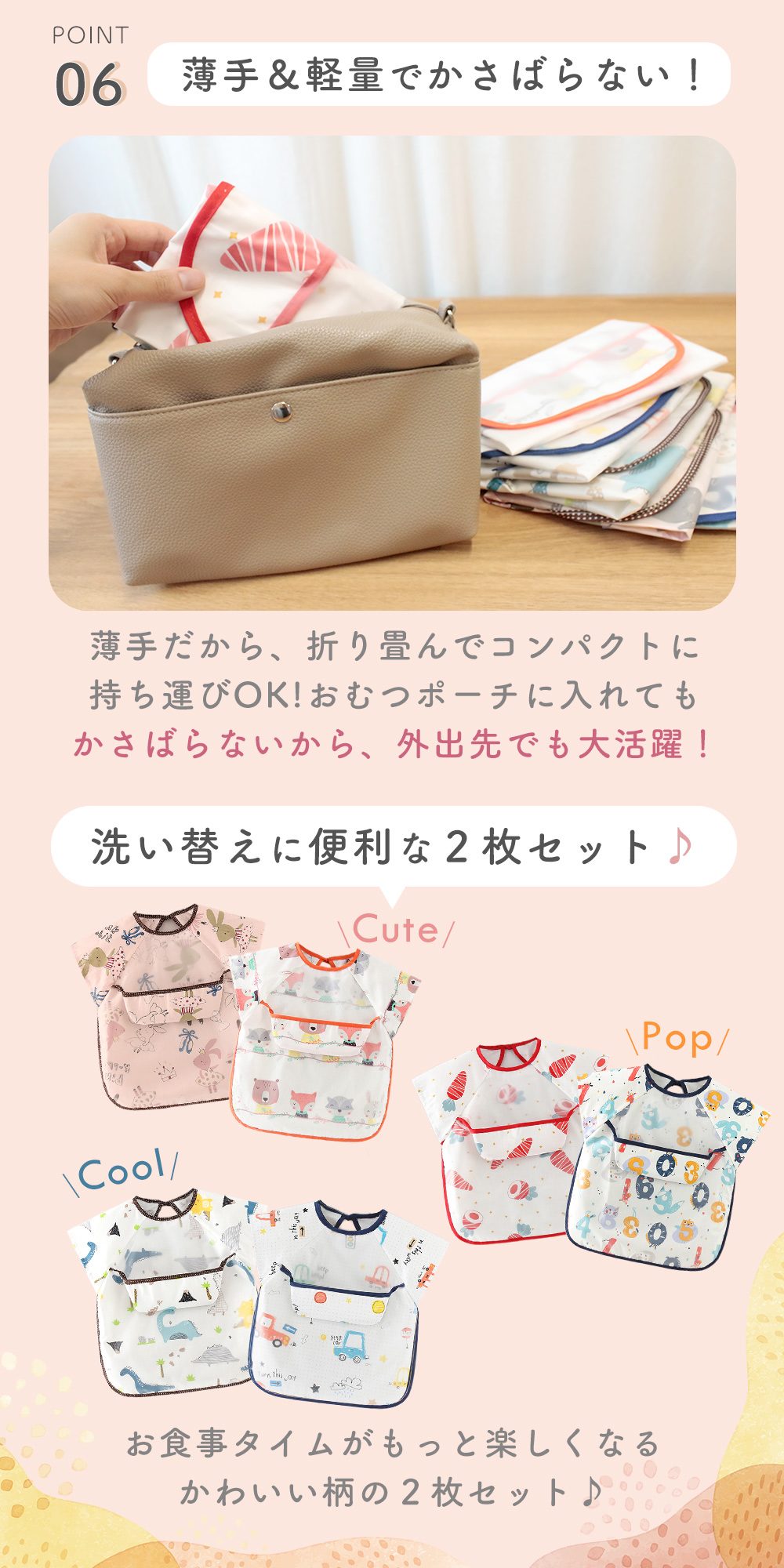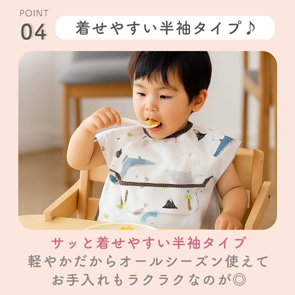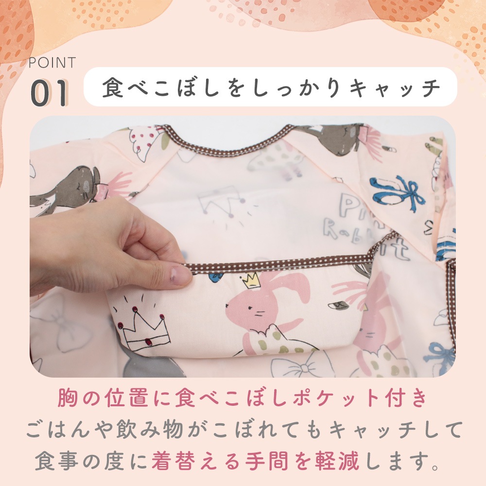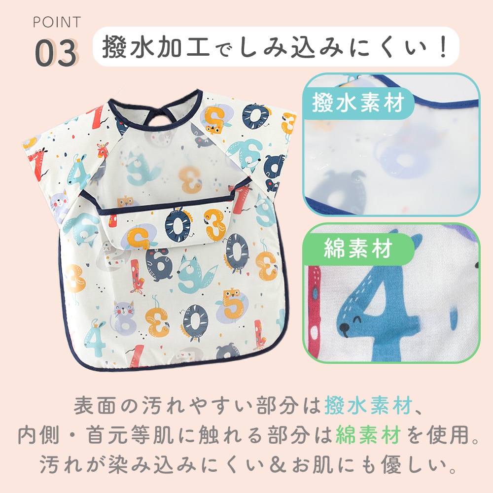 撥水加工が施されており、離乳食やお食い初め、幼児期の食べこぼし対策にぴったりです。