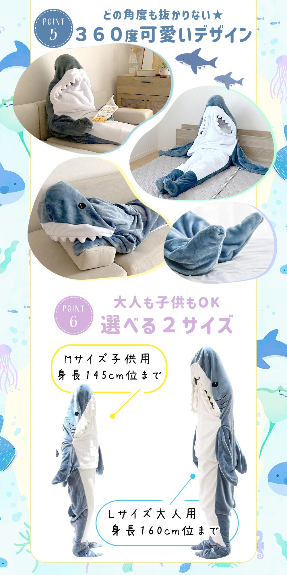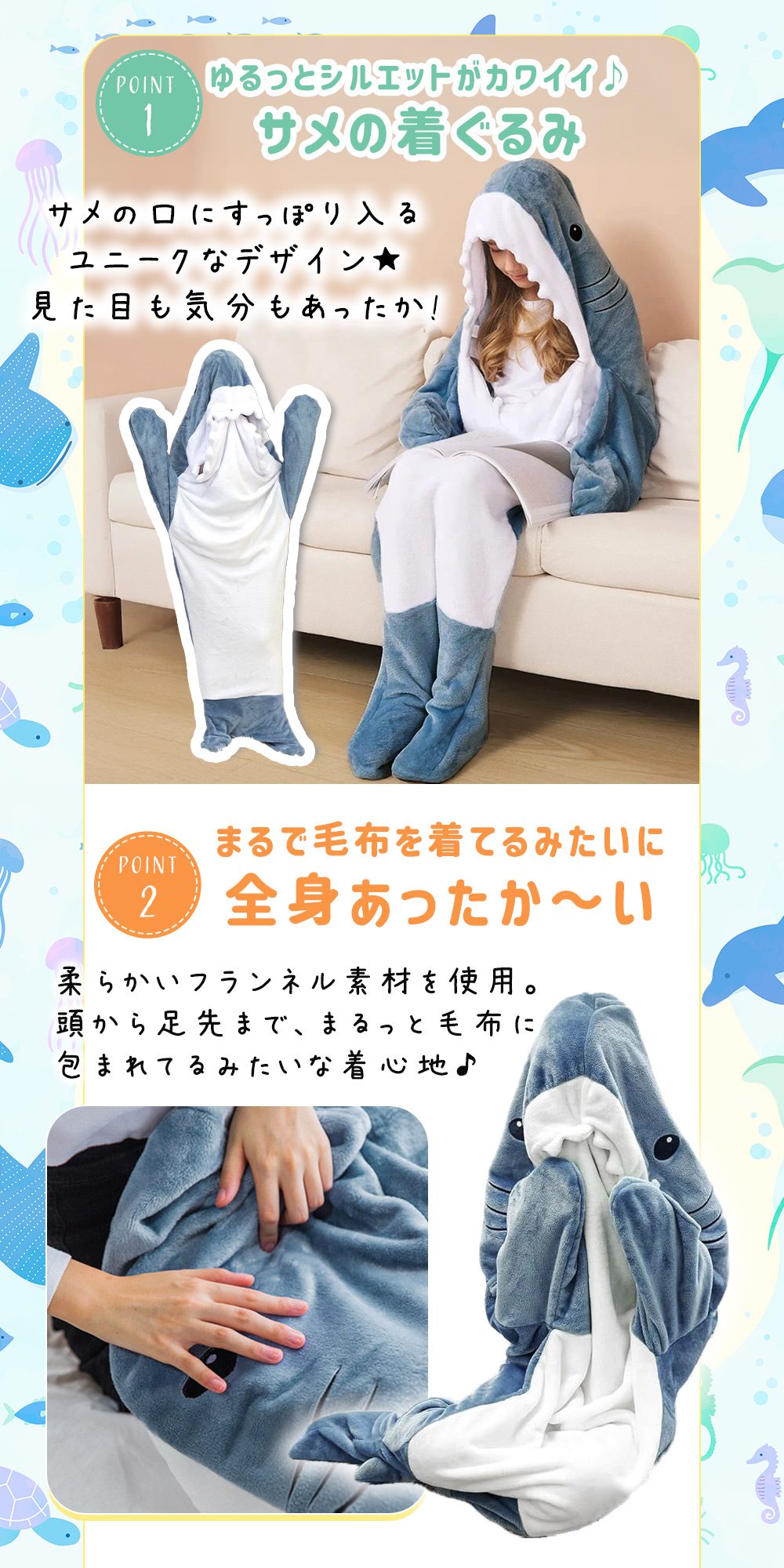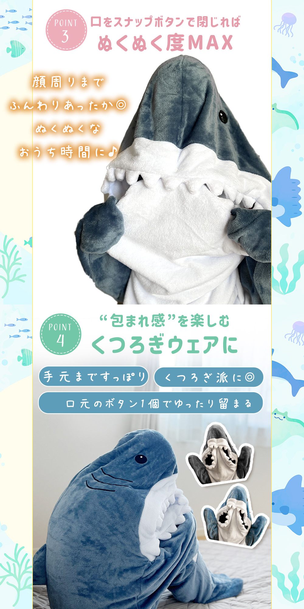 冬のリラックス、防寒、在宅ワーク、読書タイム、映画鑑賞、車中泊、キャンプの休憩時、就寝時の着る毛布、子供部屋のくつろぎ、ギフトにも。サメ好きの方やアニマルデザインが好きな方にぴったりです。