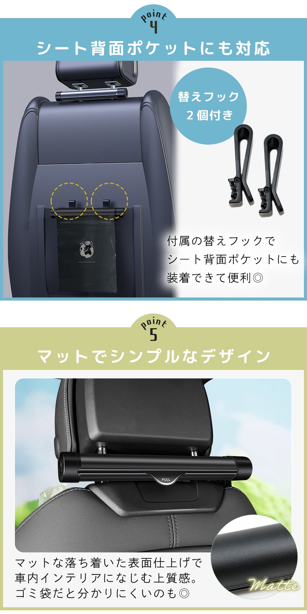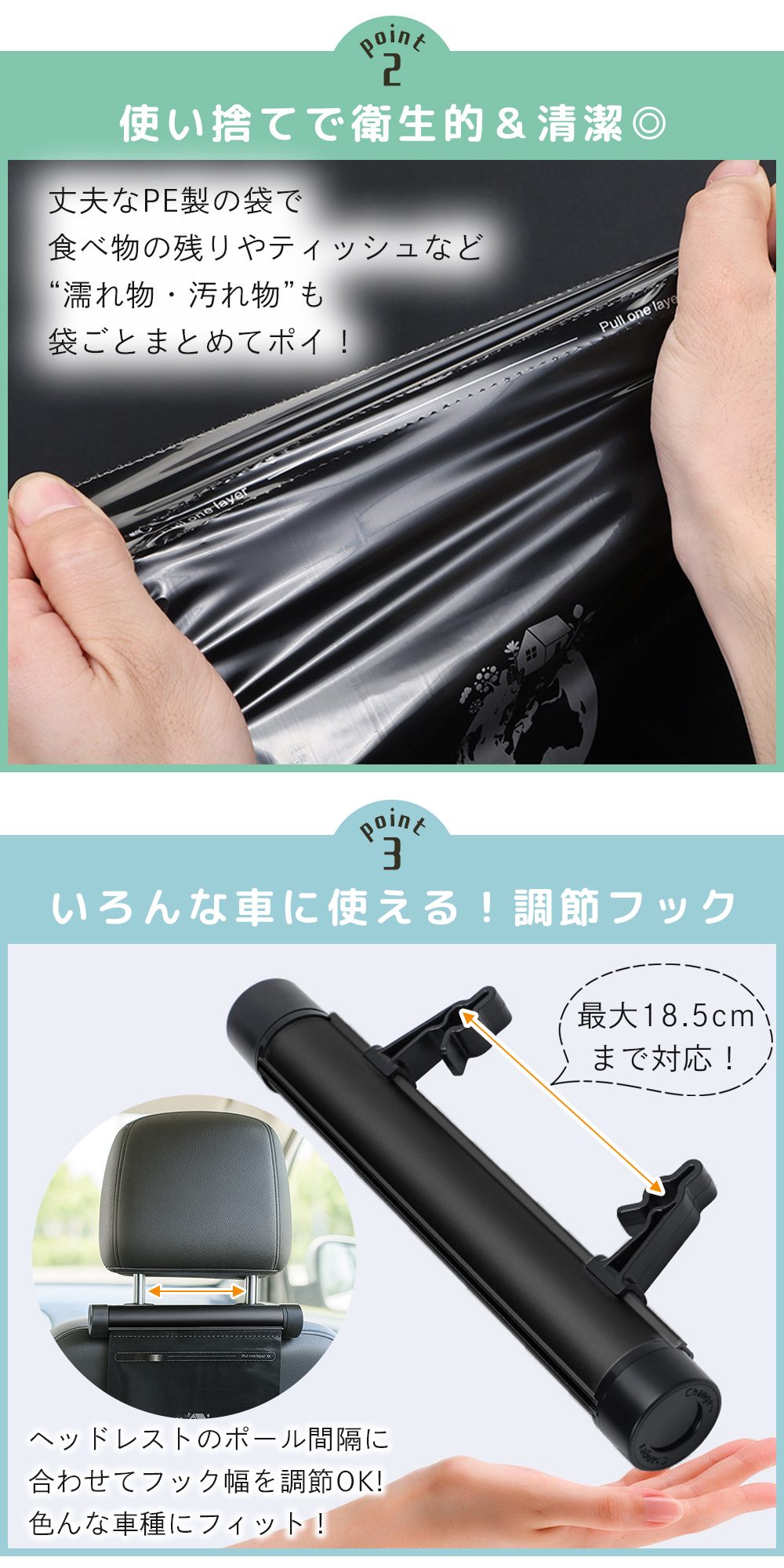シートヘッドレストに簡単取付。調節フック付きでポール間隔に合わせやすく、シート背面ポケット用フックにも付け替えOK。後部座席のデッドスペースを活用でき、ドライブ中も邪魔にならない省スペース設計。