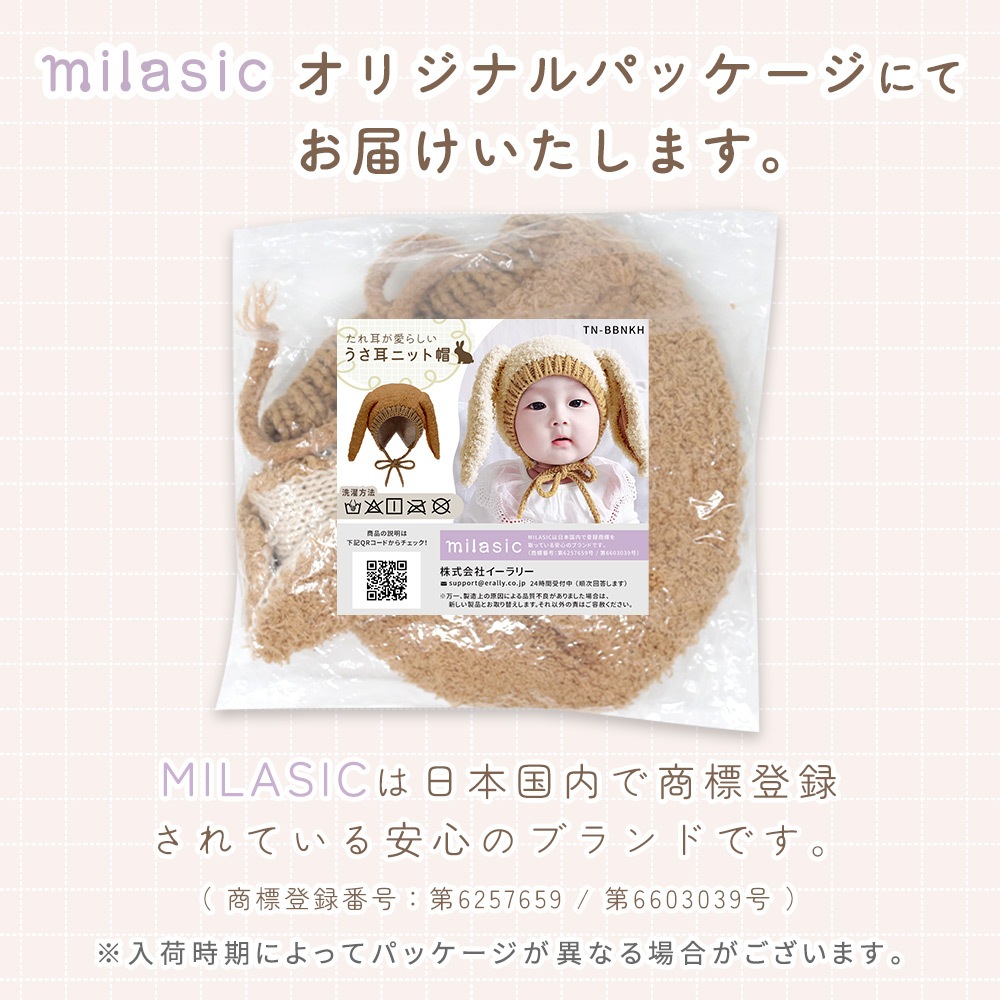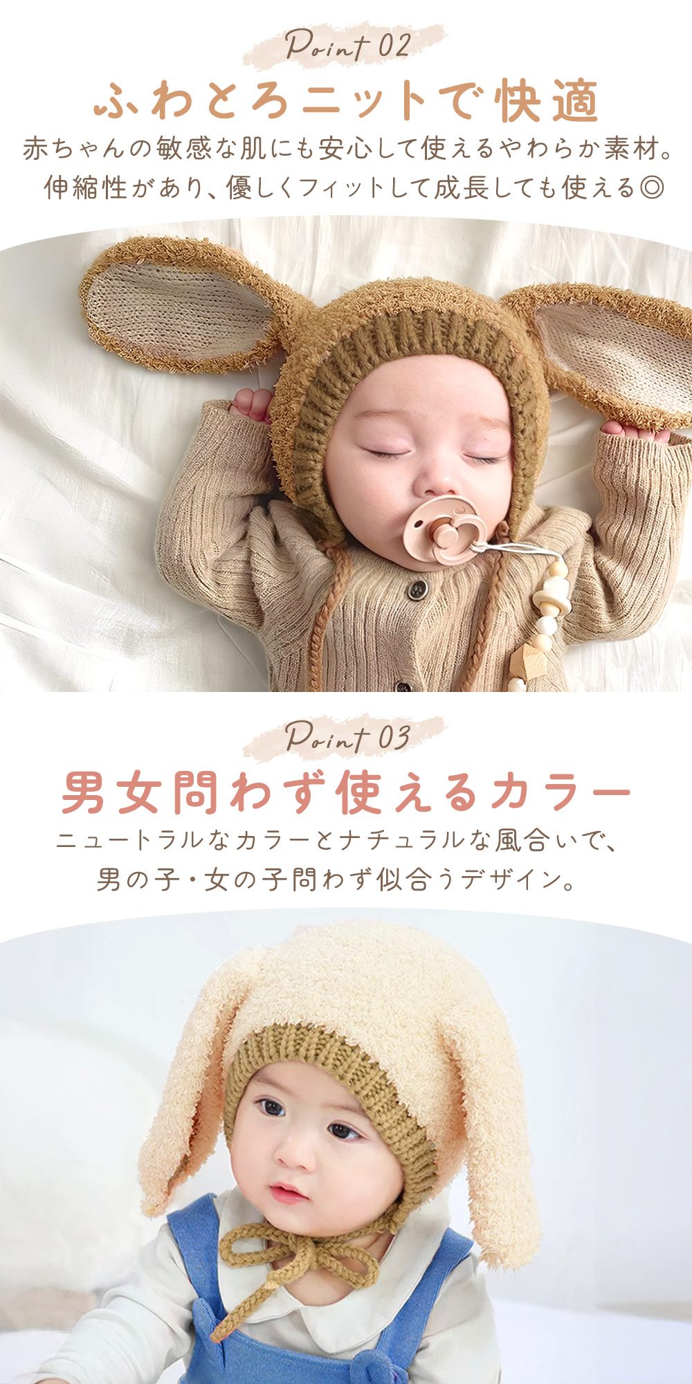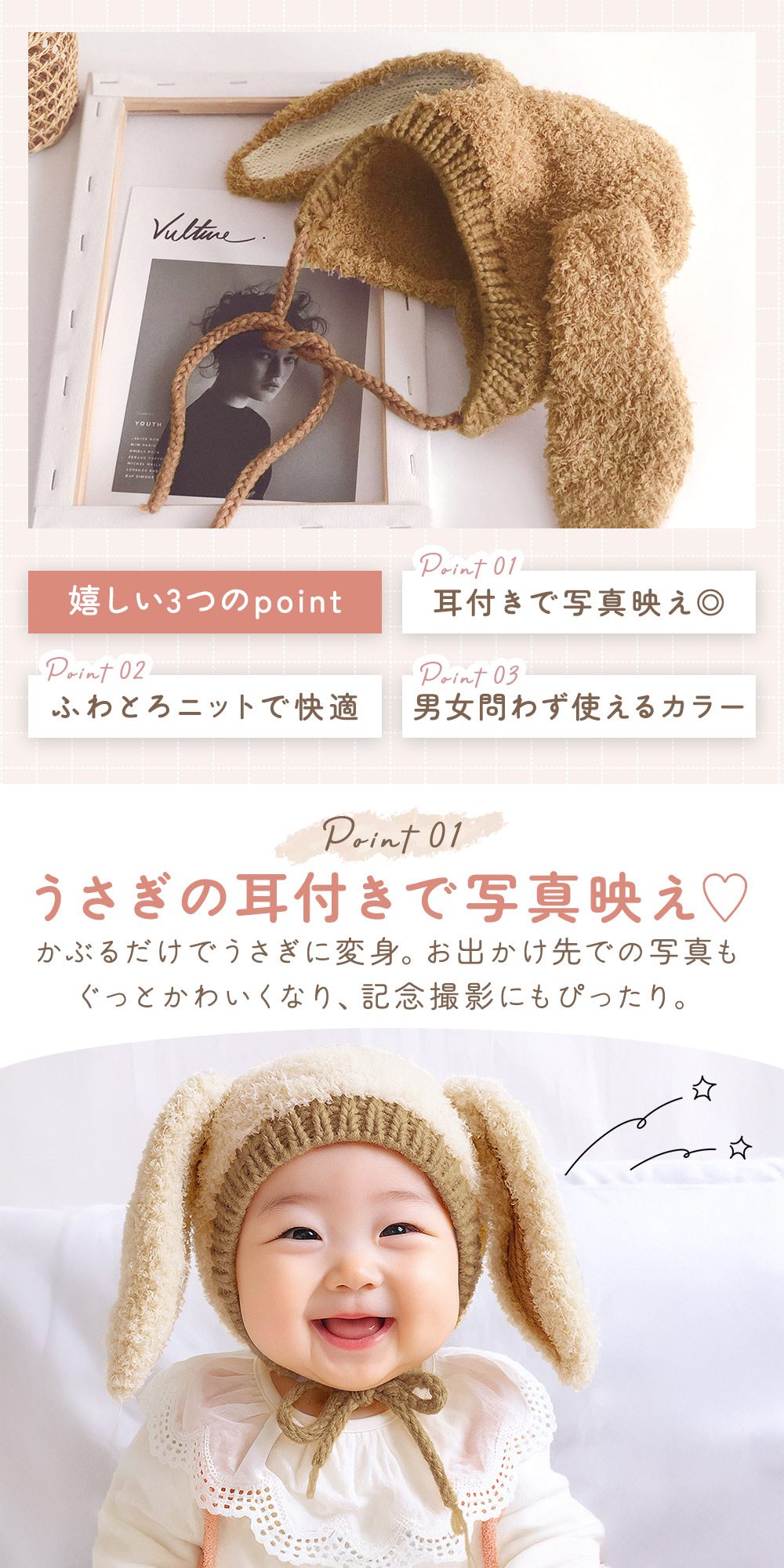 ふわふわのニット素材で作られた、うさ耳付きのベビー帽子です。
