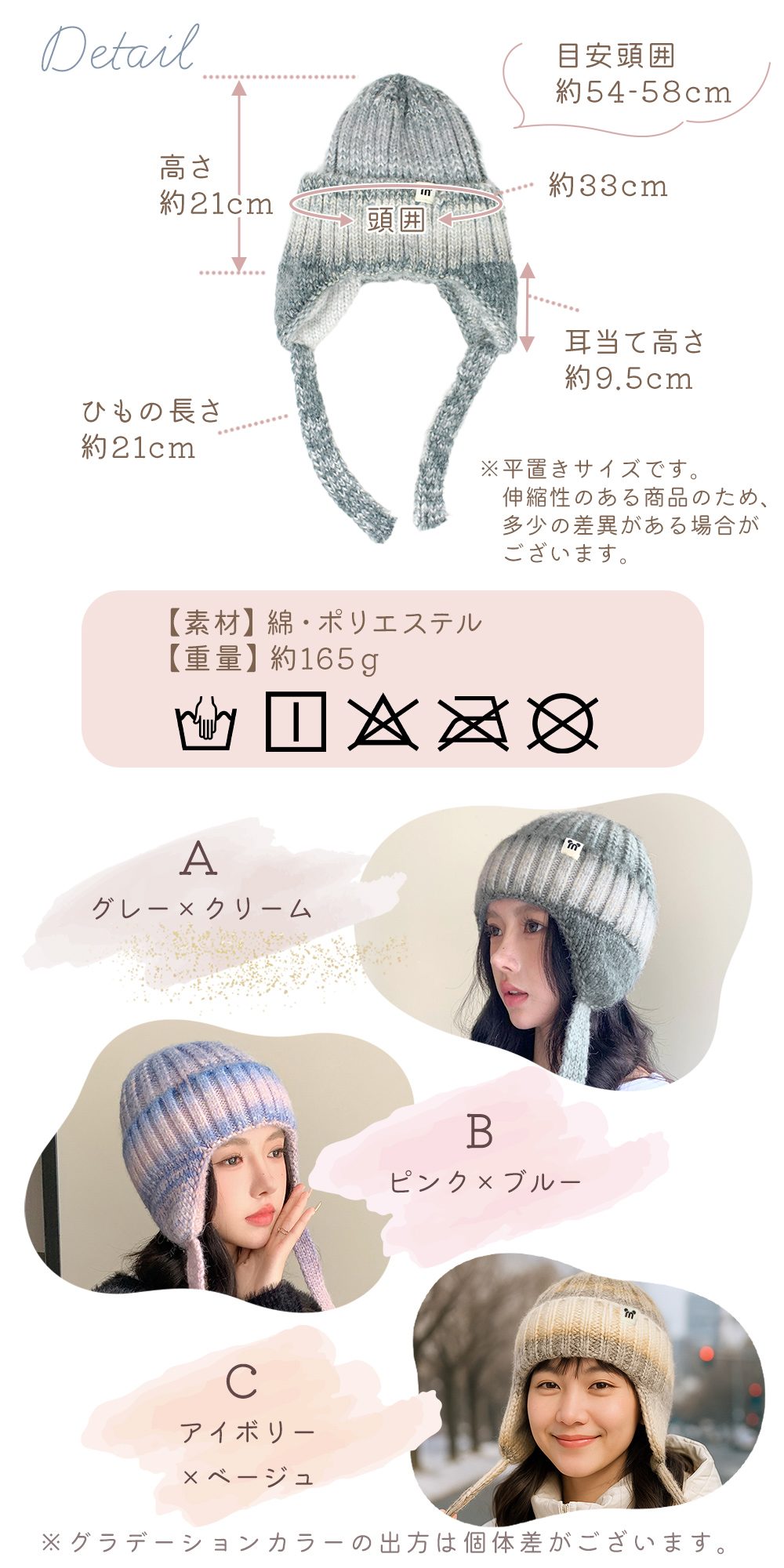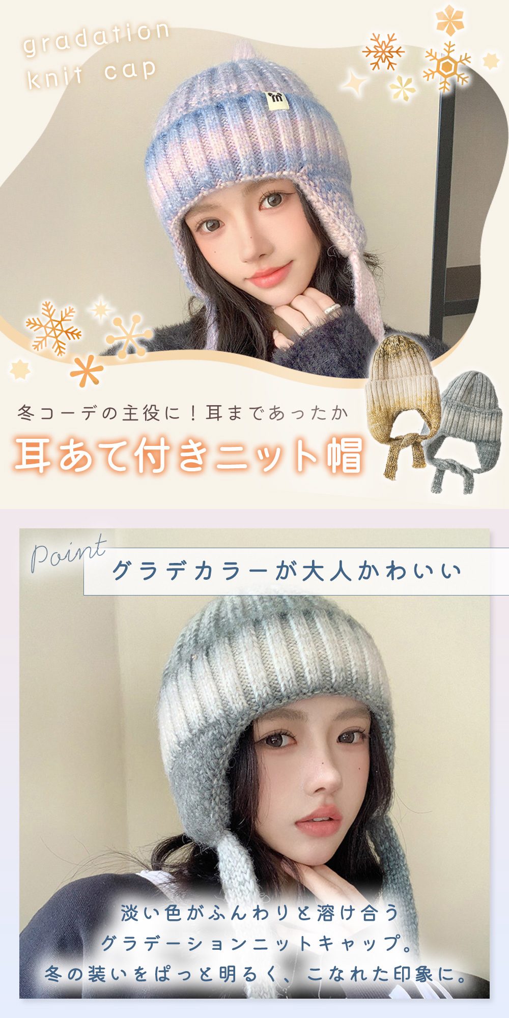冬コーデのアクセントになるグラデーションカラー。かわいい×おしゃれを両立し、カジュアルにもきれいめにも合わせやすい。ギフトにも選びやすい上品なニット帽です。