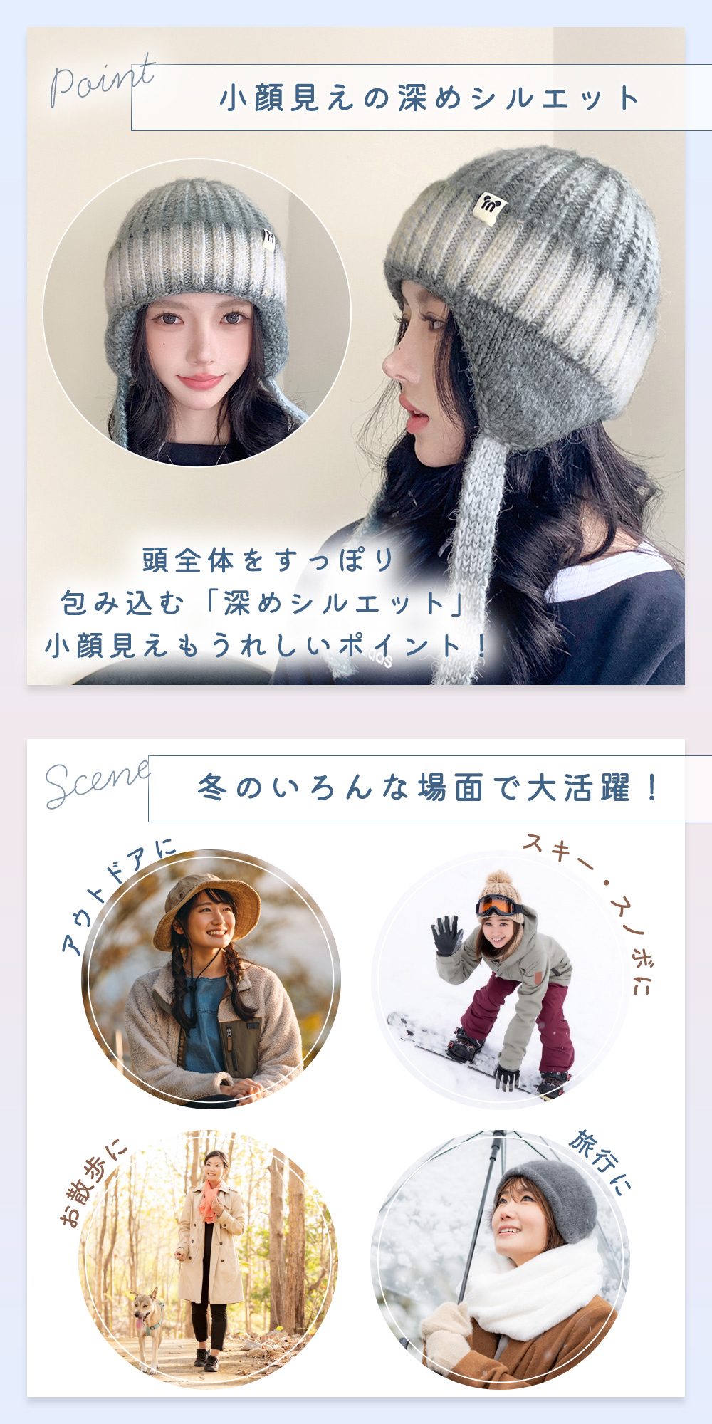 通勤通学、買い物、雪山レジャー、アウトドア、冬旅行まで幅広く活躍。防寒しながらも軽やかな被り心地でデイリーに頼れるアイテム。深めシルエットでずり上がりにくいのもポイントです。