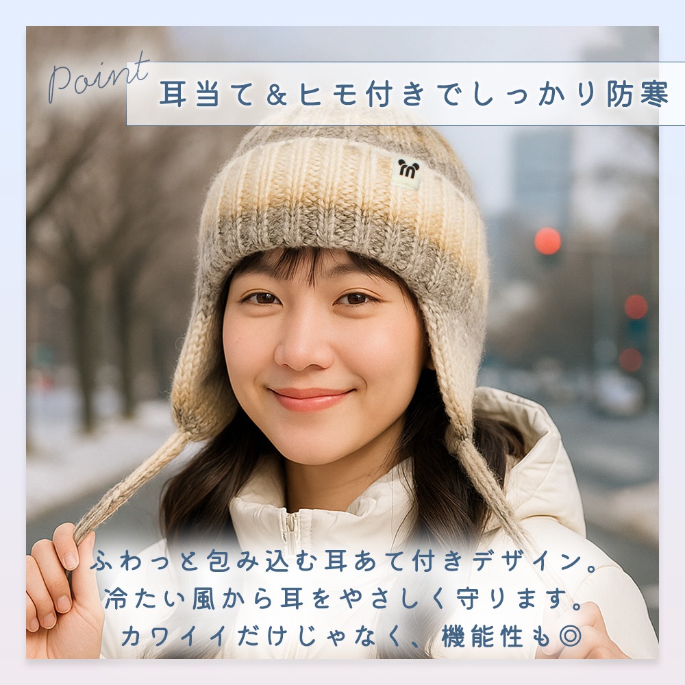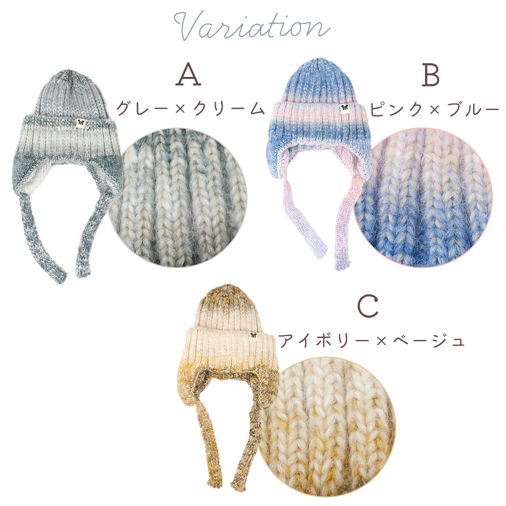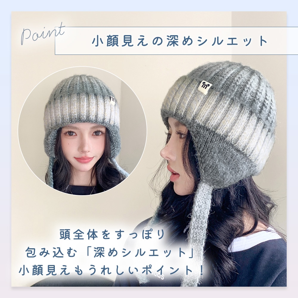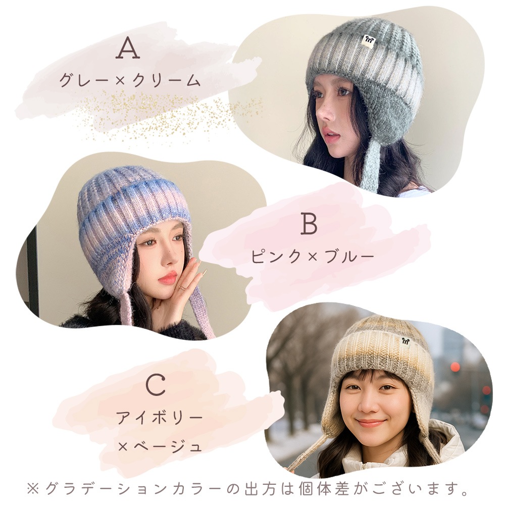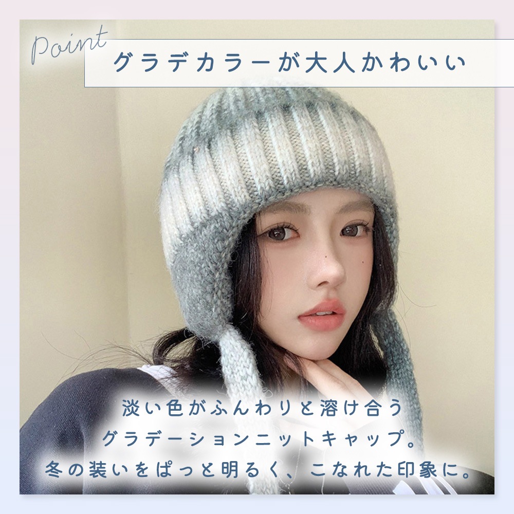 耳付きニット帽 レディース 防寒 あったか やわらか 冷気対策 防風 保温 ひも付き 耳当て付き 伸縮フィット グラデーション かわいい おしゃれ ギフト