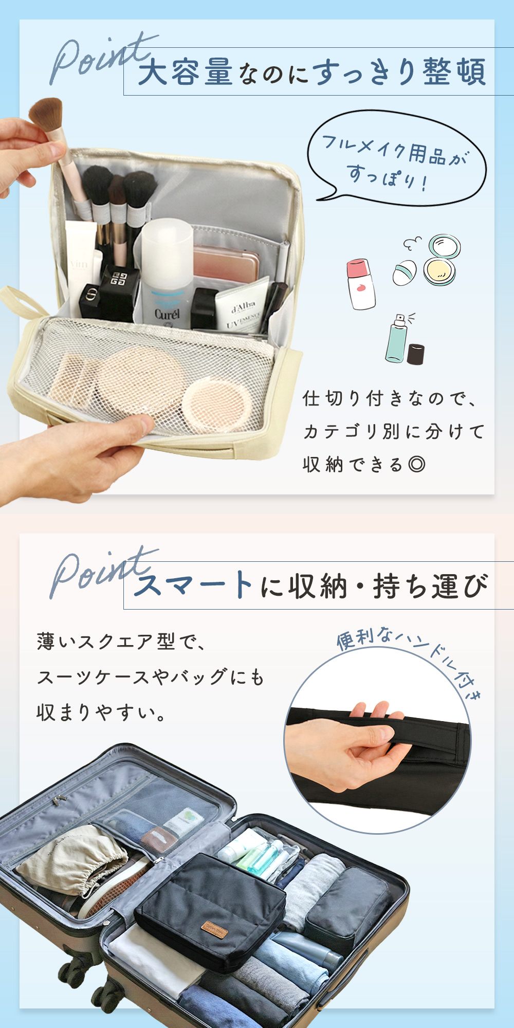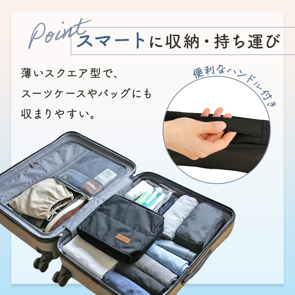 軽量で薄型の化粧ポーチは、旅行や出張、ジムやお泊まりなどの持ち運びにも最適です。スーツケースやバッグの中にすっきり収まり、コンパクトなのに収納力はしっかり。手持ちハンドル付きで、コスメポーチごとサッと持ち運べるので、洗面所への移動もスムーズです。撥水素材を使用しているため、水まわりでも気兼ねなく使え、汚れも拭き取りやすくデイリー使いに向いています。