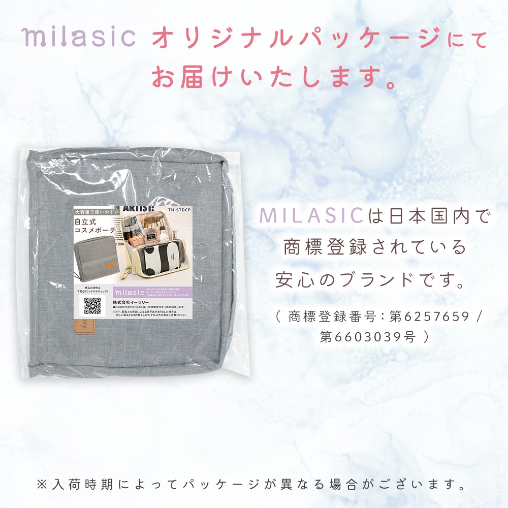 薄型のスクエア型なので、省スペースで置けるのも嬉しいポイント。化粧台が狭い場所でも、立てたまま開いて使えるため、メイクスペースを広く取れない一人暮らしのお部屋や洗面台でも活躍します。自立する縦型ポーチなので、開いたままでも倒れにくく、メイクの途中に手が当たっても安心です。スマホを立てかけられるメッシュ部分は、動画を見ながらメイクしたい方にもぴったりです。