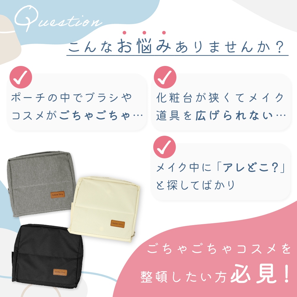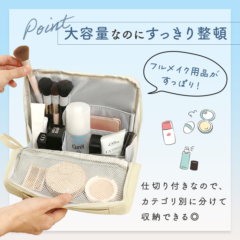 見た目はシンプルでコンパクトながら、フルメイク用品がしっかり入る大容量タイプ。ブラシホルダーや仕切り付きポケットでカテゴリ分けができ、下地・ファンデーション・アイシャドウ・リップなどの化粧品を効率よく収納できます。メッシュポケットにはパフやコットンなどを入れても見つけやすく、使いたいものをサッと取り出せます。ポーチの中で迷子になりがちな細かなコスメ道具も、整頓しながら収納できる使いやすい設計です。