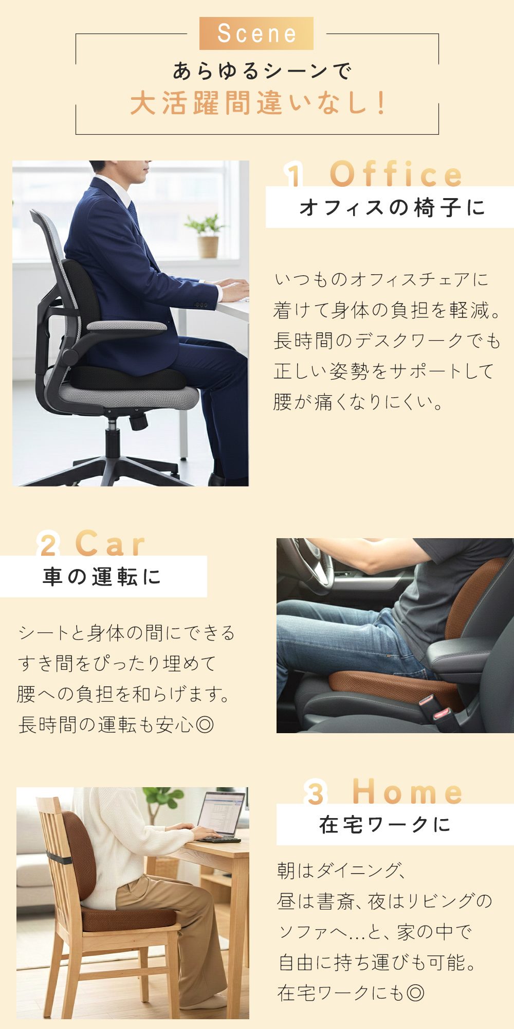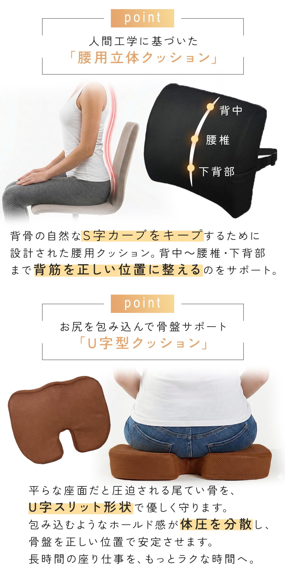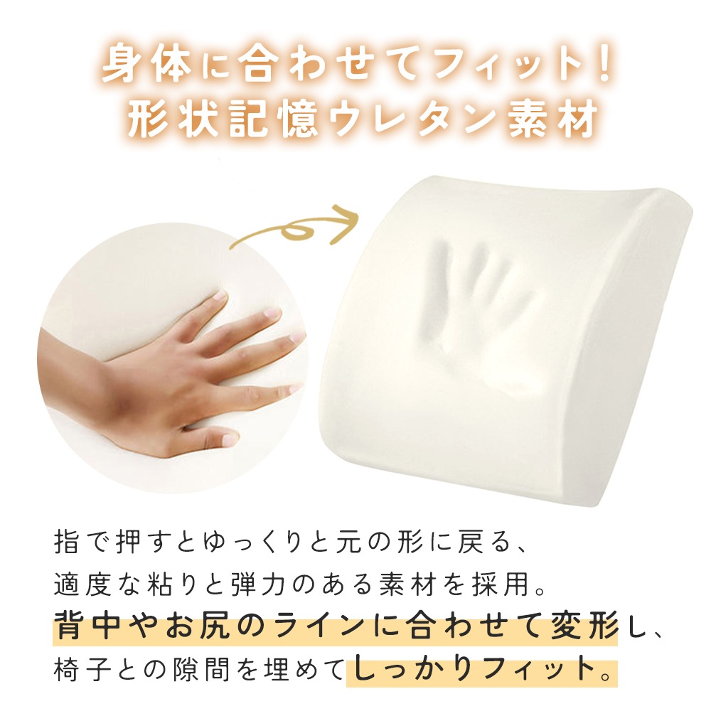 ・立体形状の腰用クッションで姿勢をラクに
