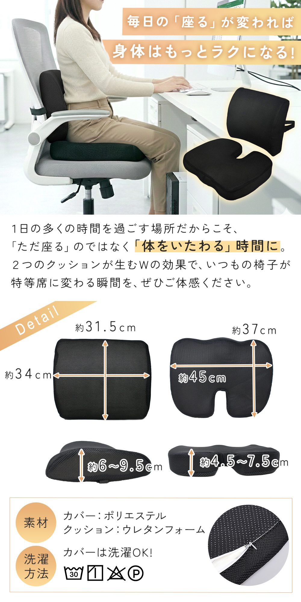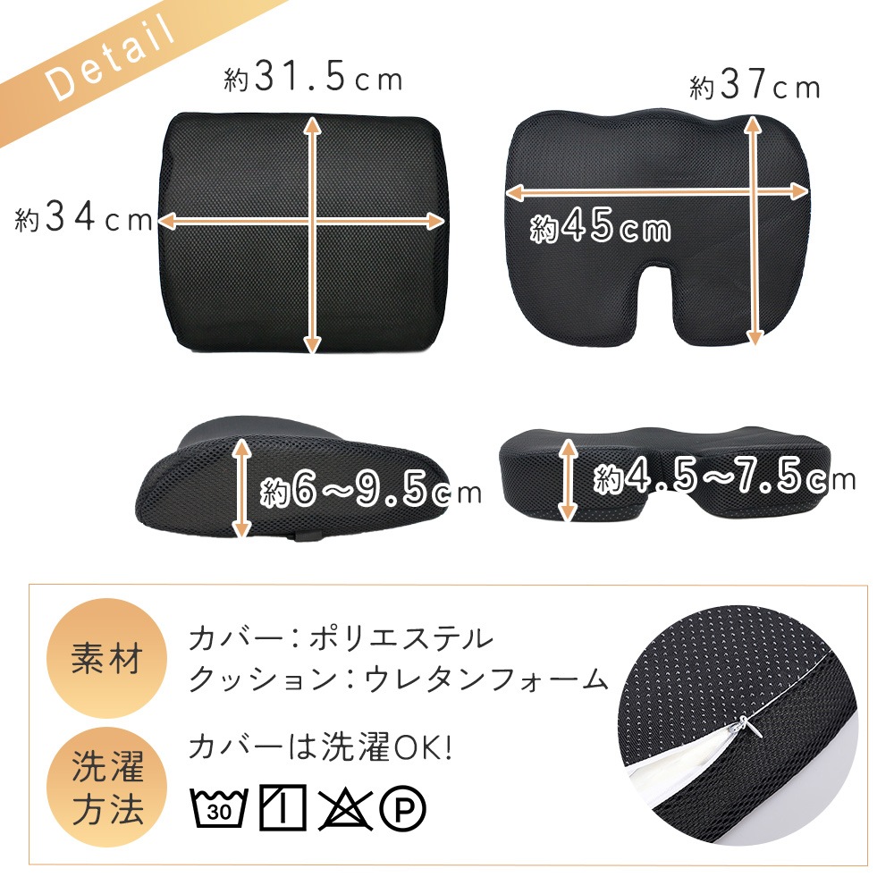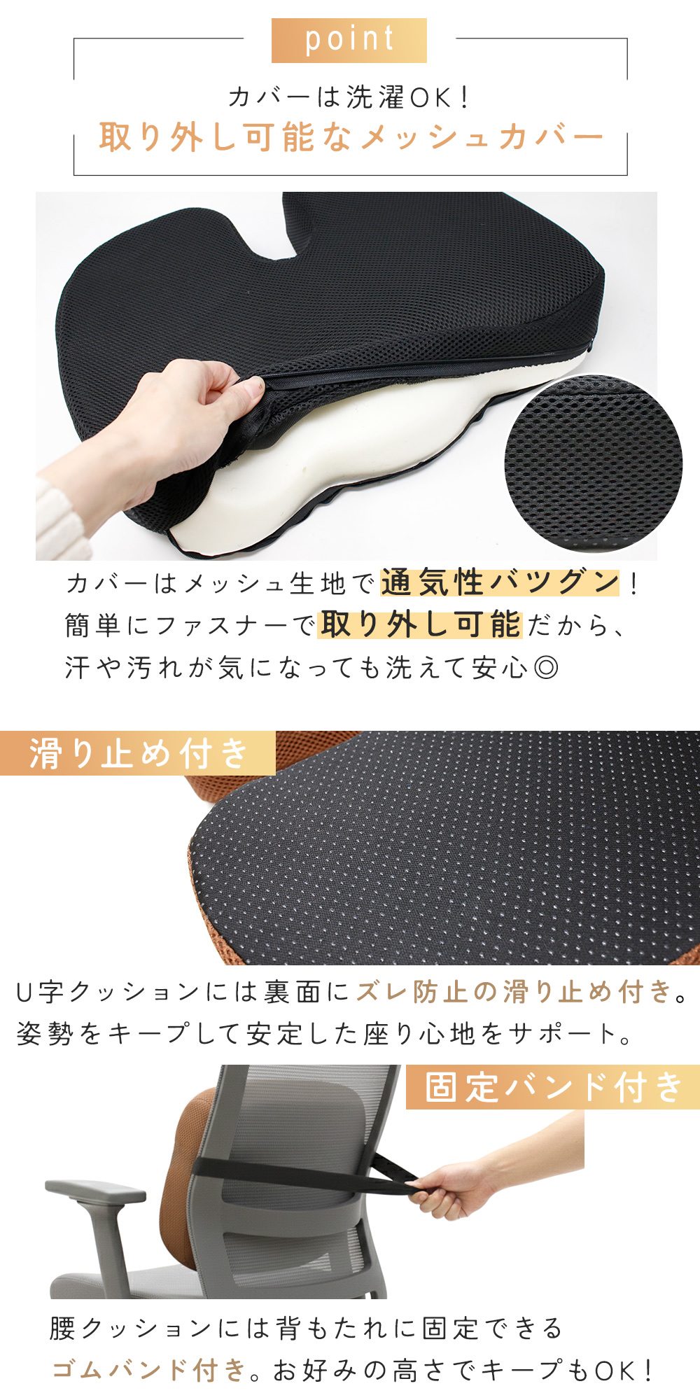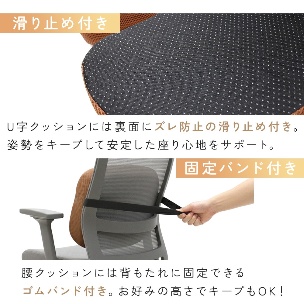メッシュカバーで通気性バツグン。ムレが気になりにくく、季節を問わず快適です。ファスナー式で取り外し可能、洗濯OKだから清潔に使えて安心。U字クッション裏面には滑り止め付きで、座っている間のズレ防止にも役立ちます。